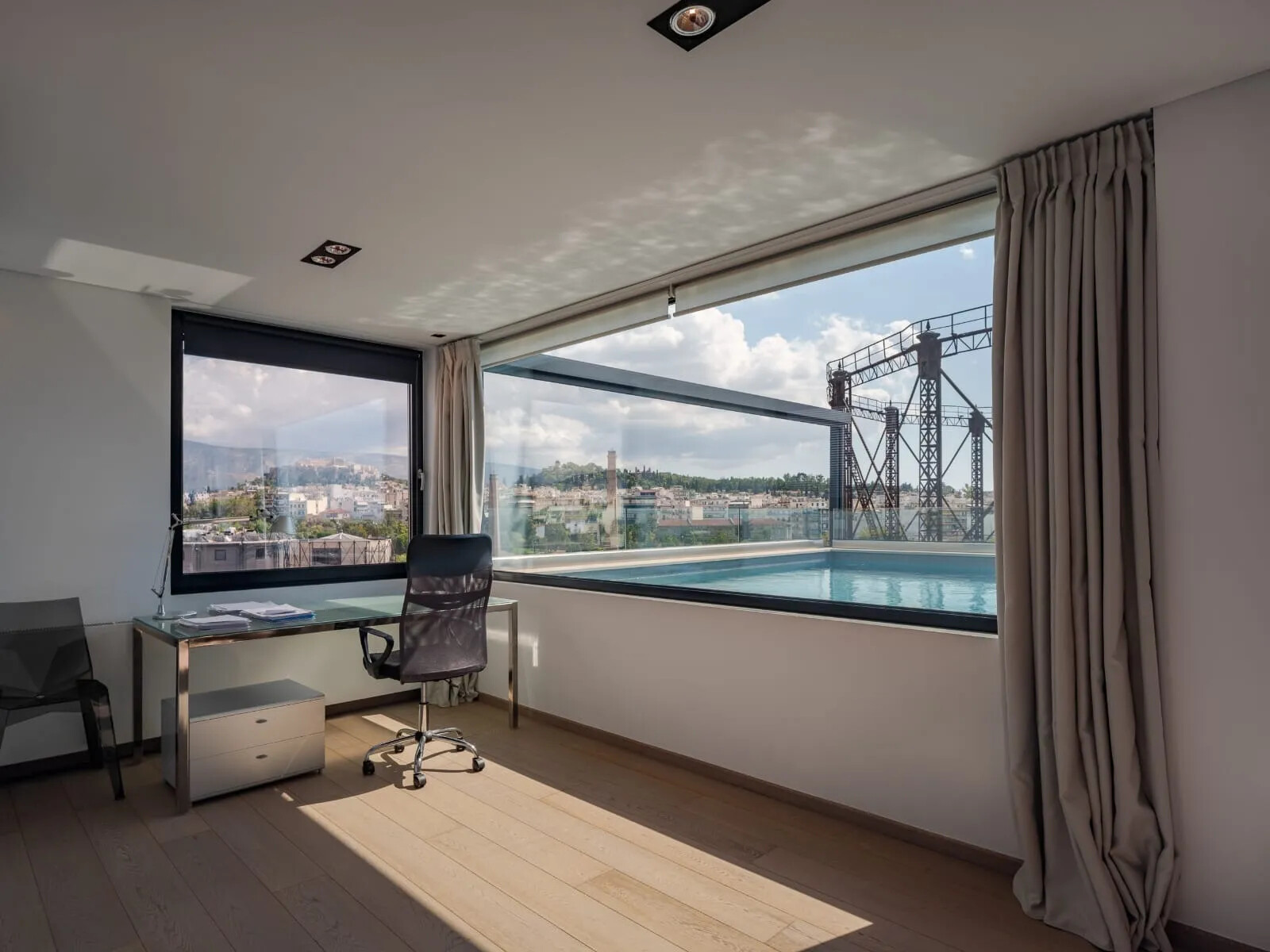 An internal staircase leads to the 6th floor where you’ll find an office area with a kitchenette and access to a private terrace. This outdoor sanctuary includes an overflow swimming pool with a surrounding deck and comfortable seating area. It is the perfect setting to enjoy the mesmerizing views of the Acropolis, the Observatory, and the mountainous backdrop of Athens.