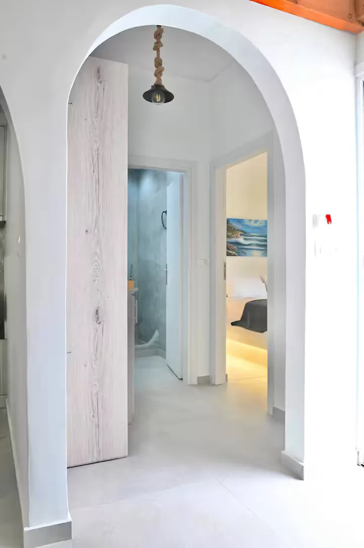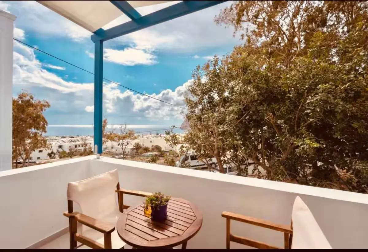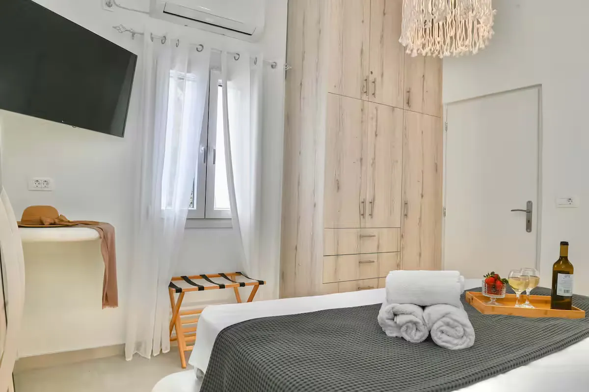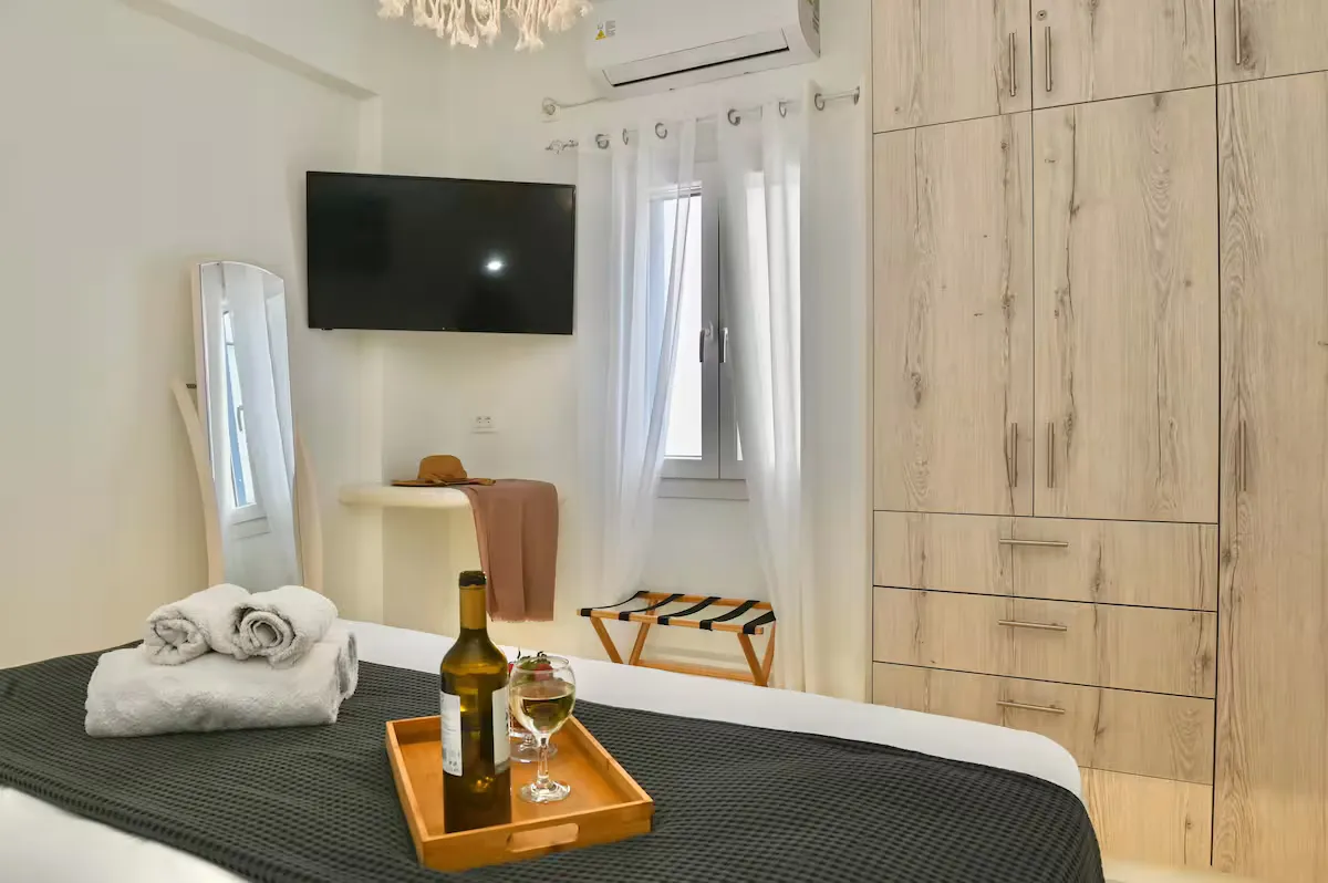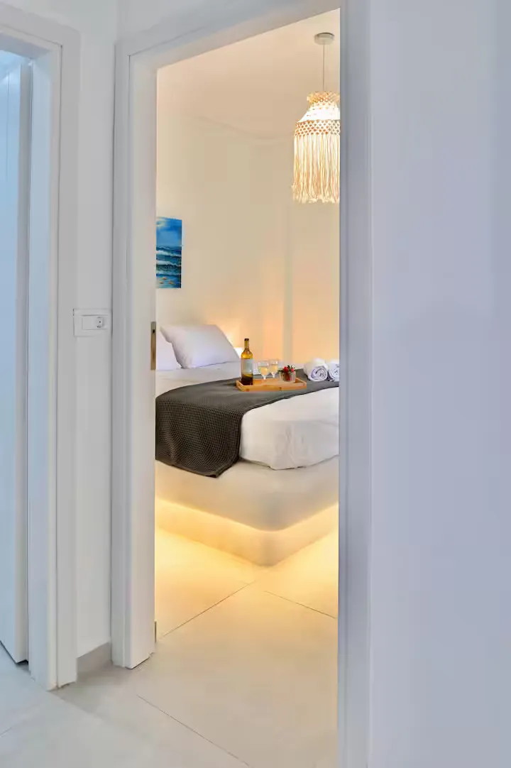 Both rooms are designed to feel serene, featuring soft bedding, ample natural light, and a relaxing ambiance inspired by Santorini’s coastal atmosphere.