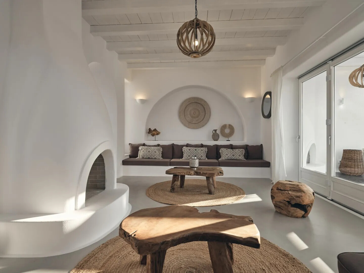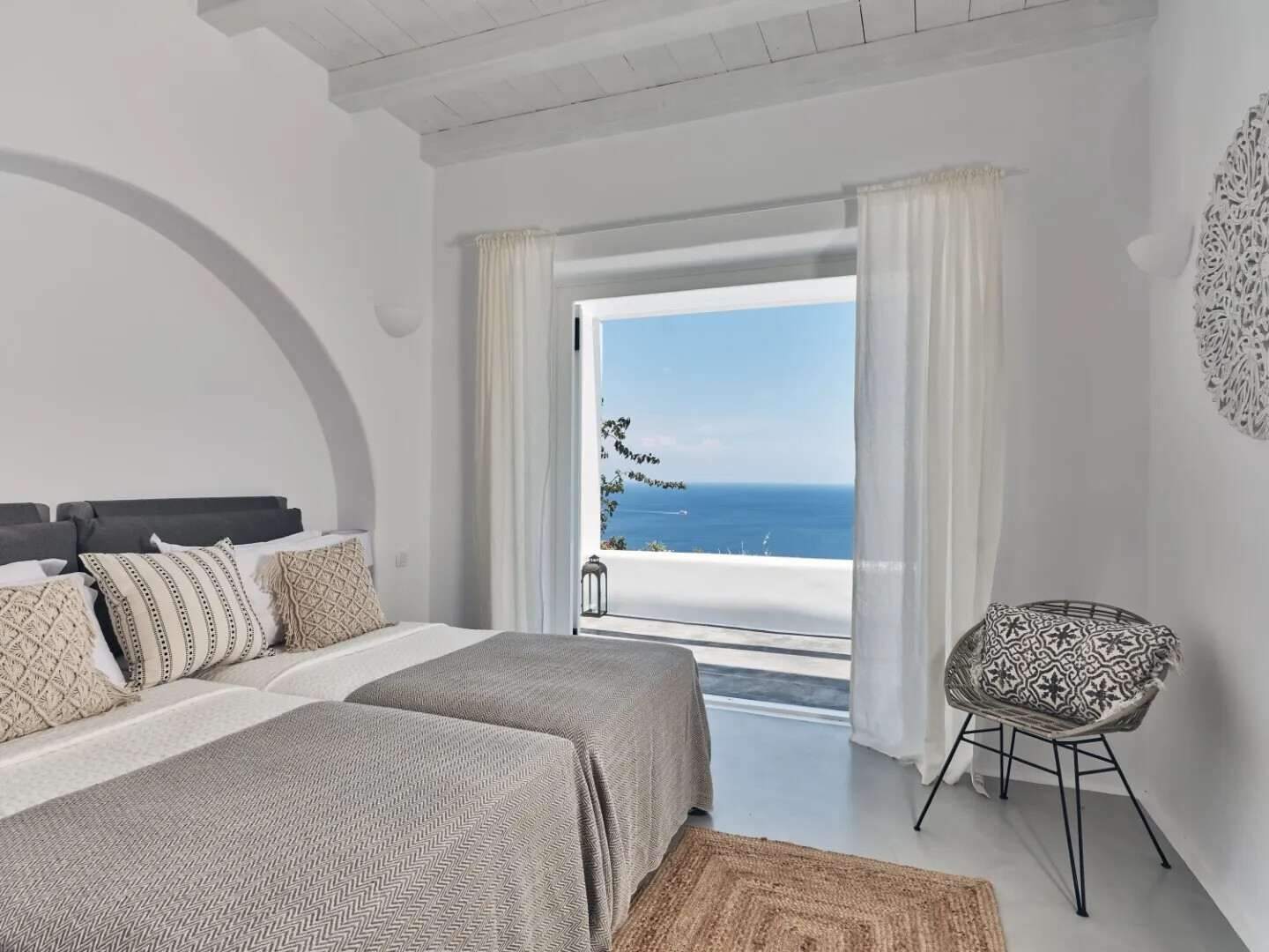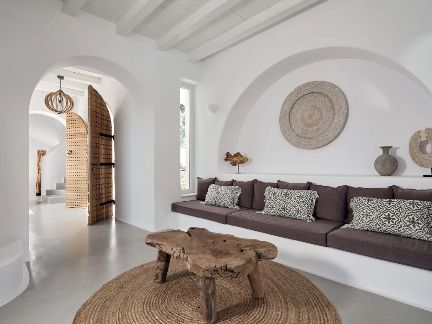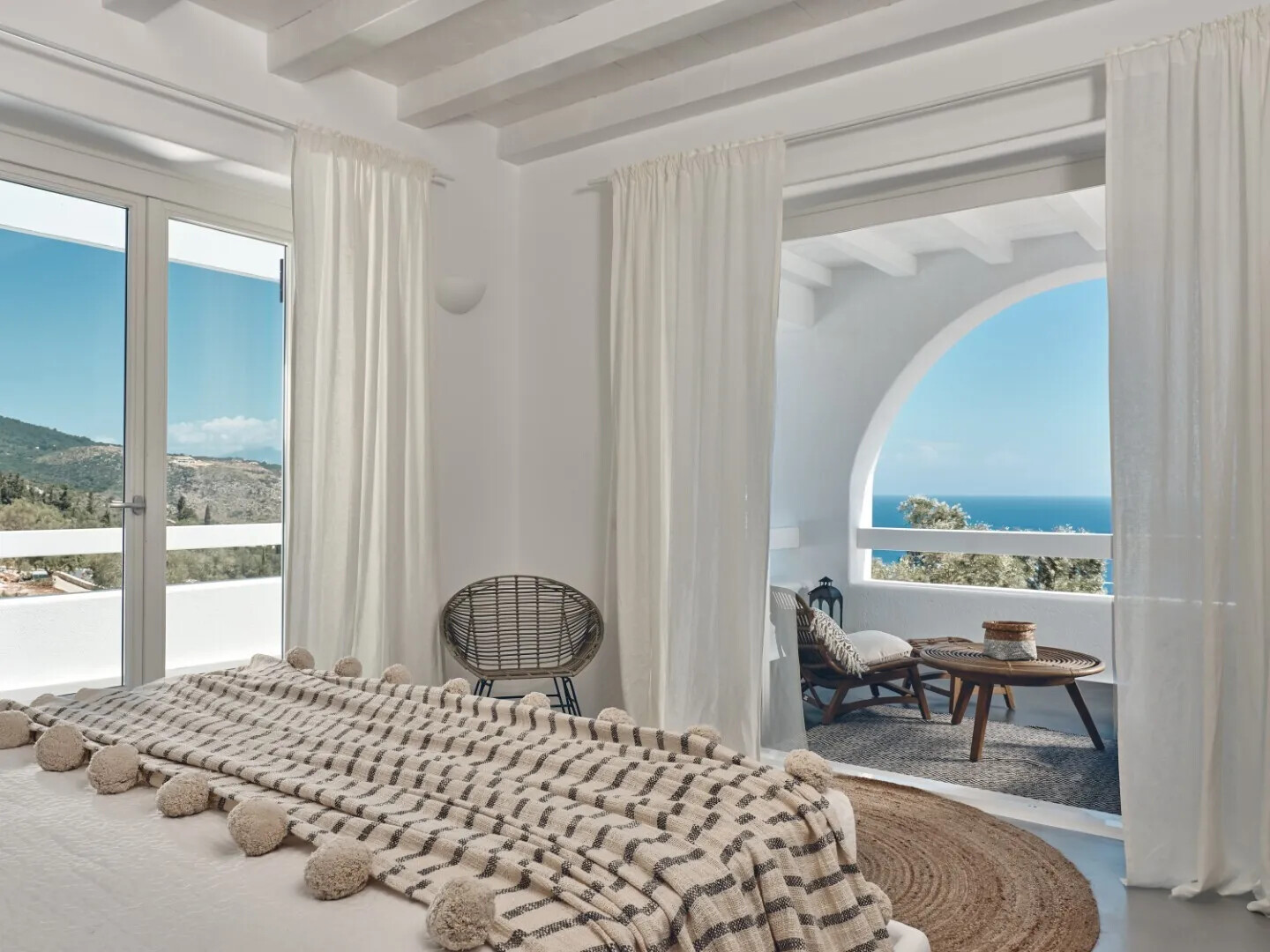 The interiors of this impressive villa for sale Zakynthos Greece showcase a refined and luxurious palette that reflects the colors of the island. A tasteful mix of whites, soft stone tones, and warm caramels creates a calm and sophisticated atmosphere throughout.