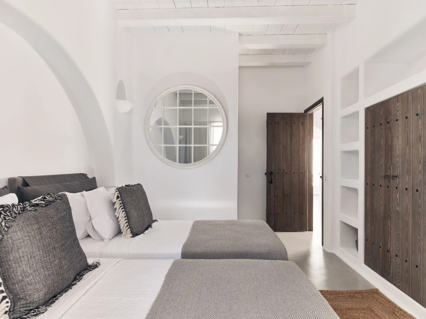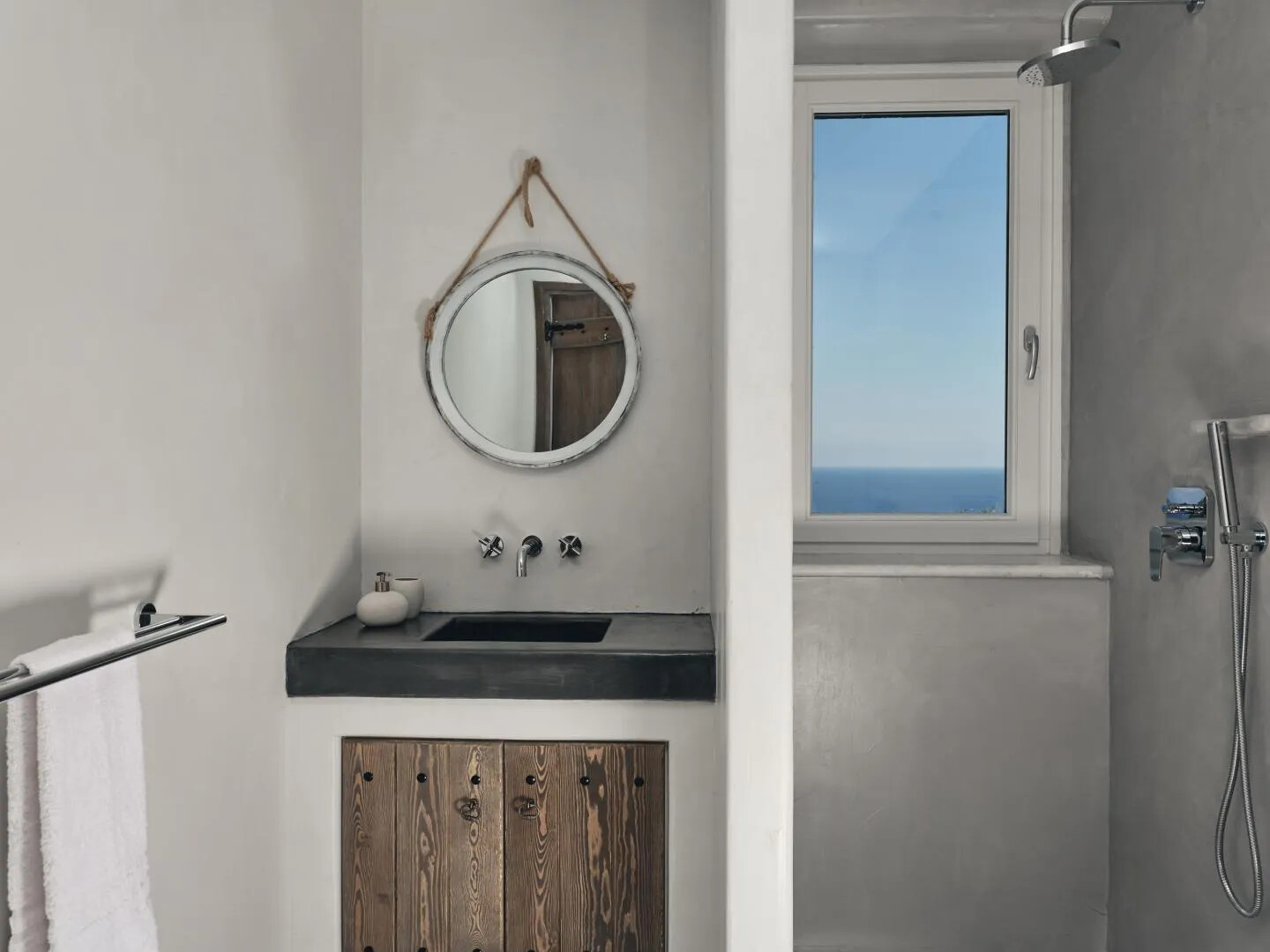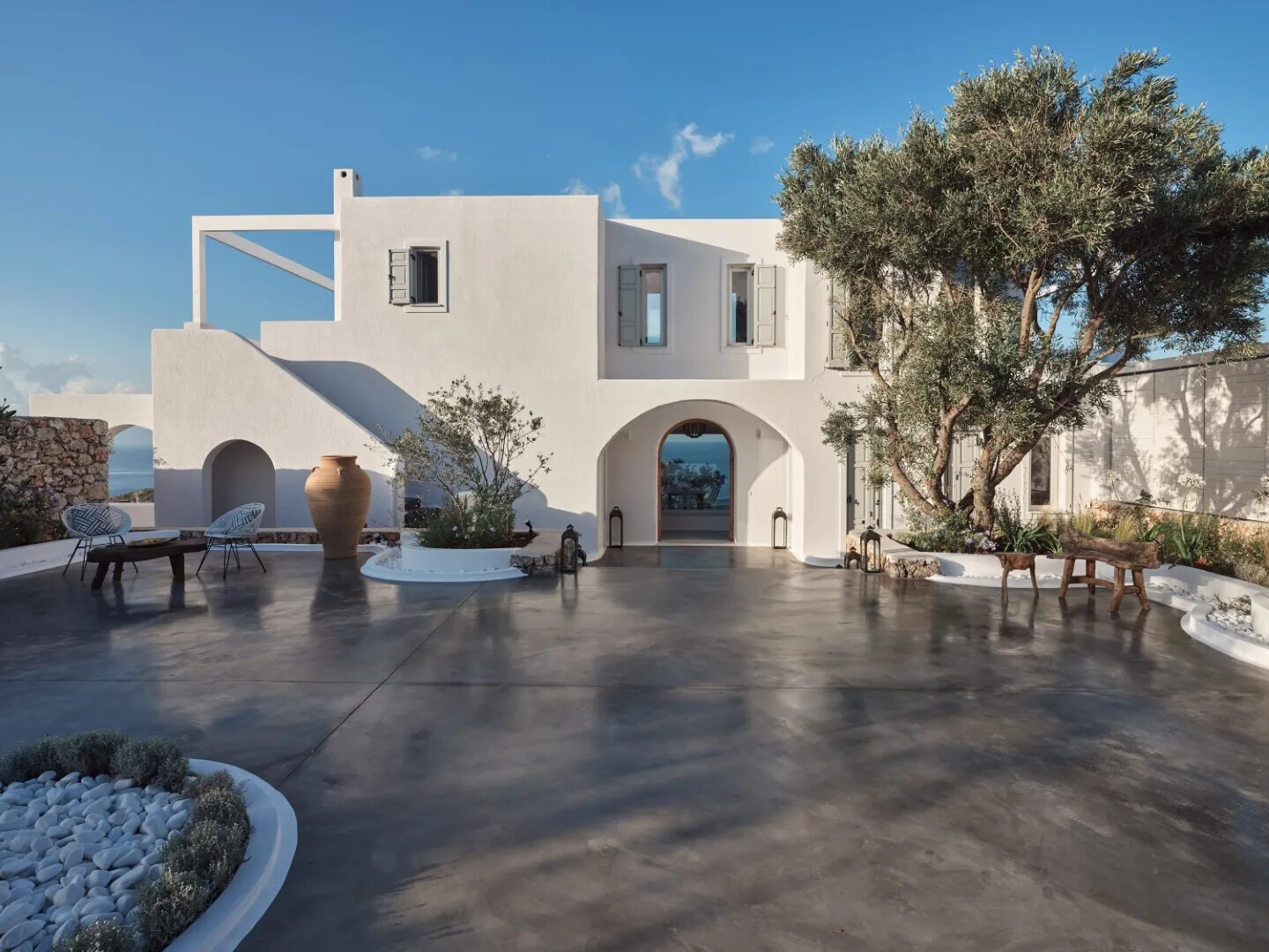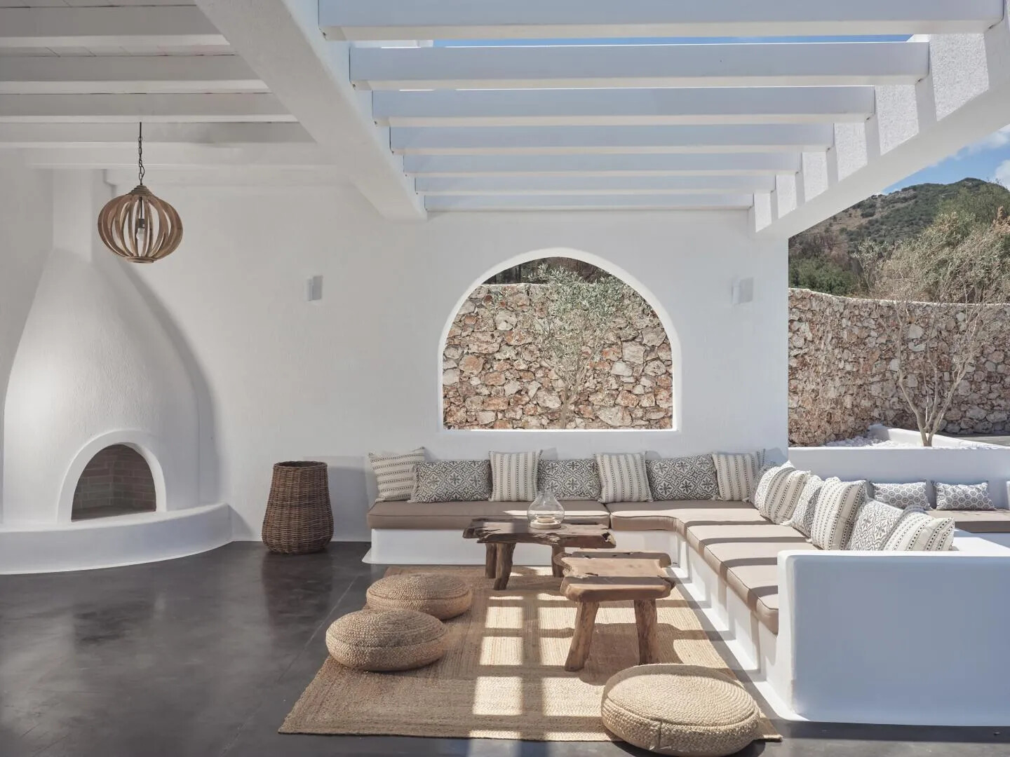 The interiors of this impressive villa for sale Zakynthos Greece showcase a refined and luxurious palette that reflects the colors of the island. A tasteful mix of whites, soft stone tones, and warm caramels creates a calm and sophisticated atmosphere throughout.