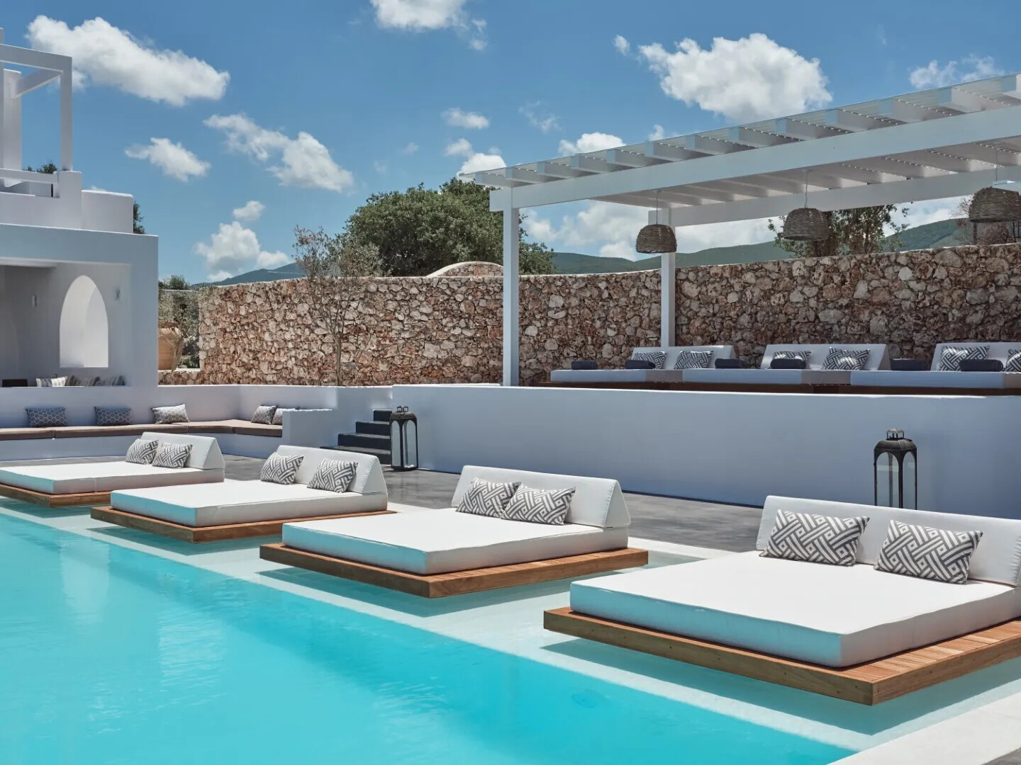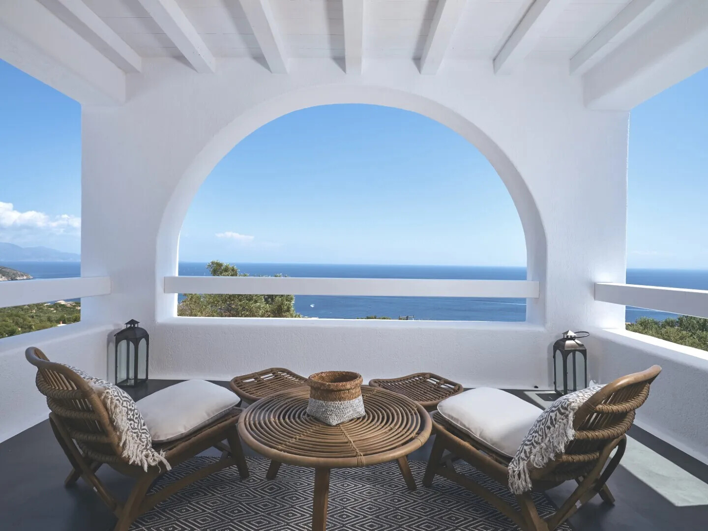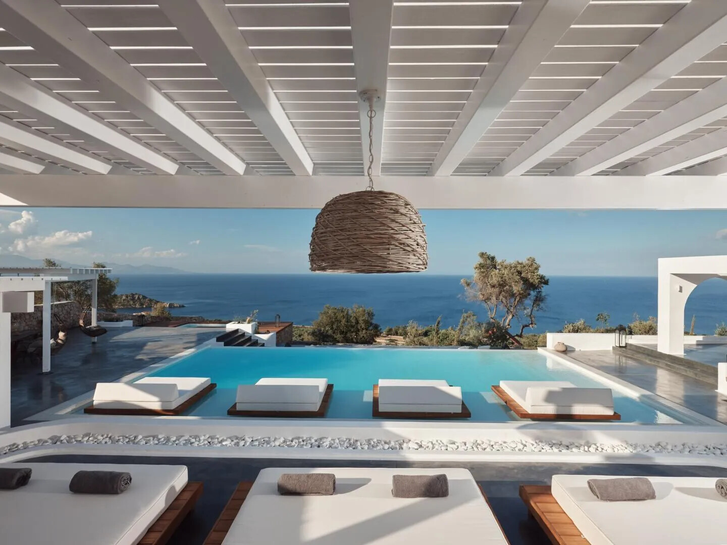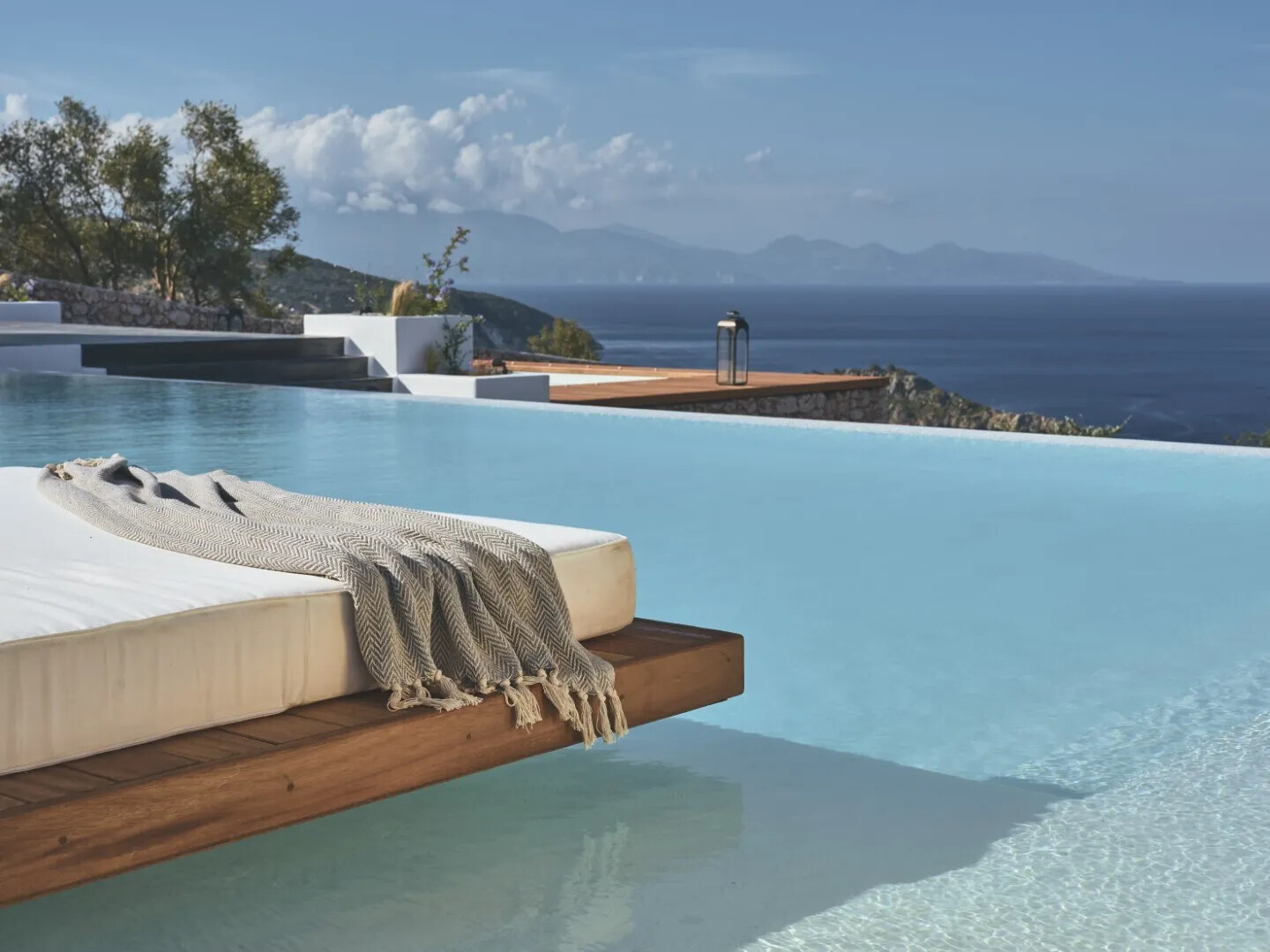 The infinity, heated swimming pool offers spectacular views of the Ionian Sea. Whether enjoying a morning swim or an evening cocktail, this poolside experience elevates the lifestyle offered by this impressive villa for sale Zakynthos Greece.