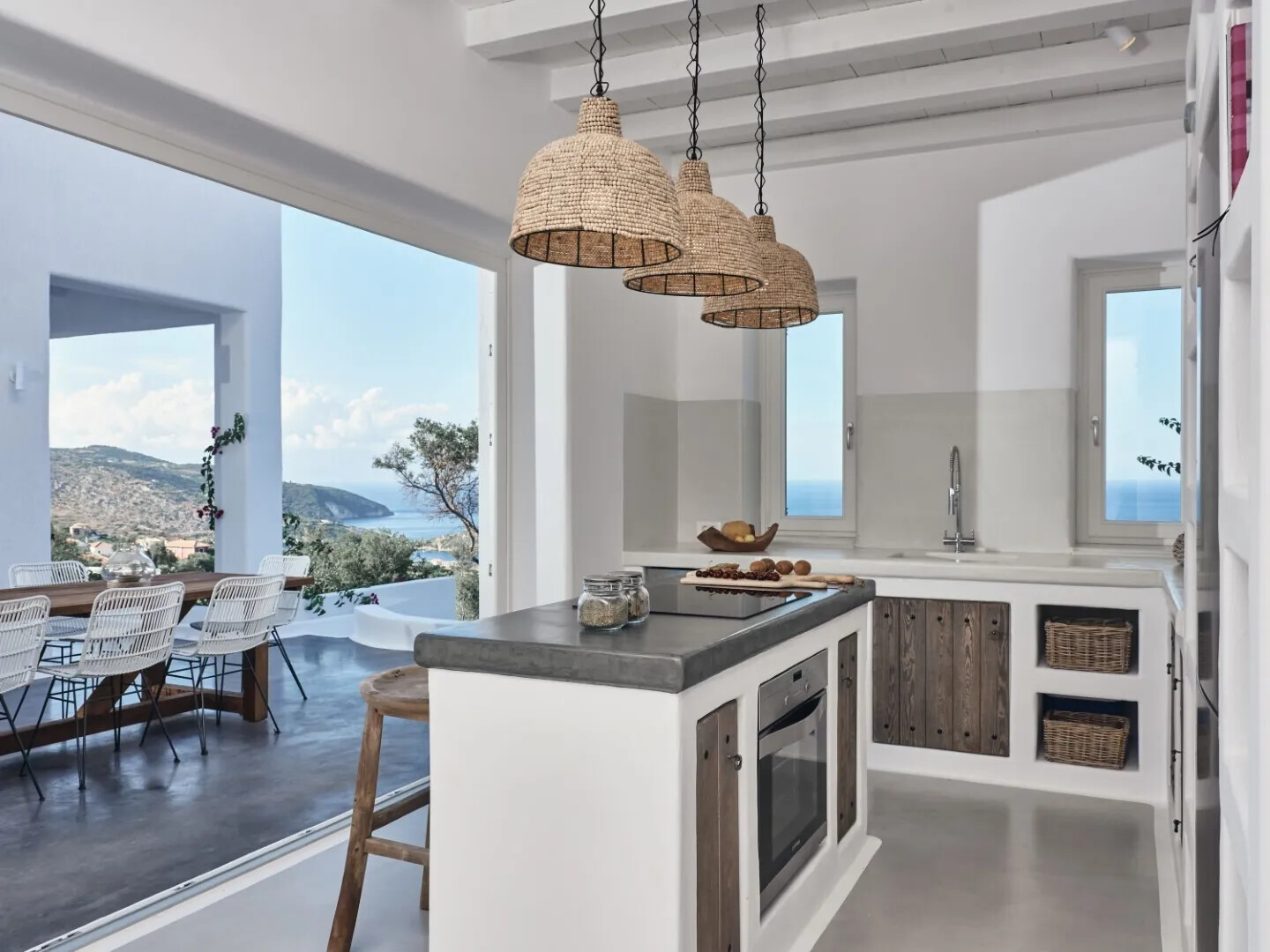 A spacious and sun-filled kitchen flows directly into the outdoor dining area, offering easy access to the terraces and seamless indoor-outdoor living.