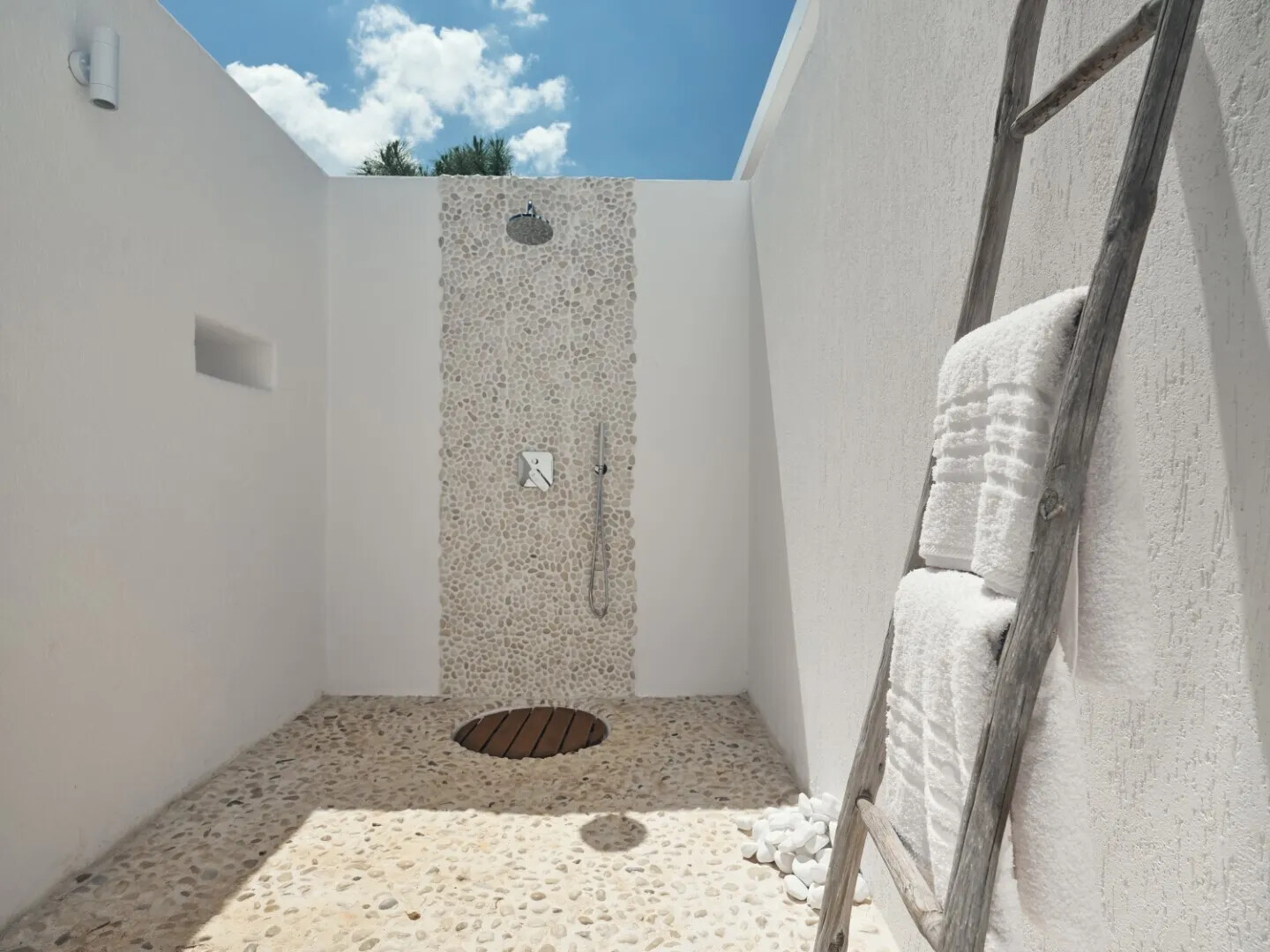 The villa’s outdoor spaces are equally impressive, offering multiple areas for relaxation and entertainment. Landscaped gardens surround a fully equipped outdoor kitchen and a covered dining area perfect for gatherings and sunset dinners.