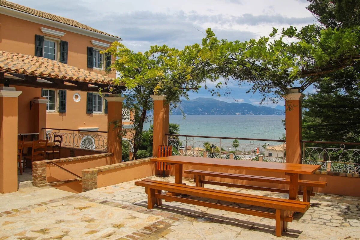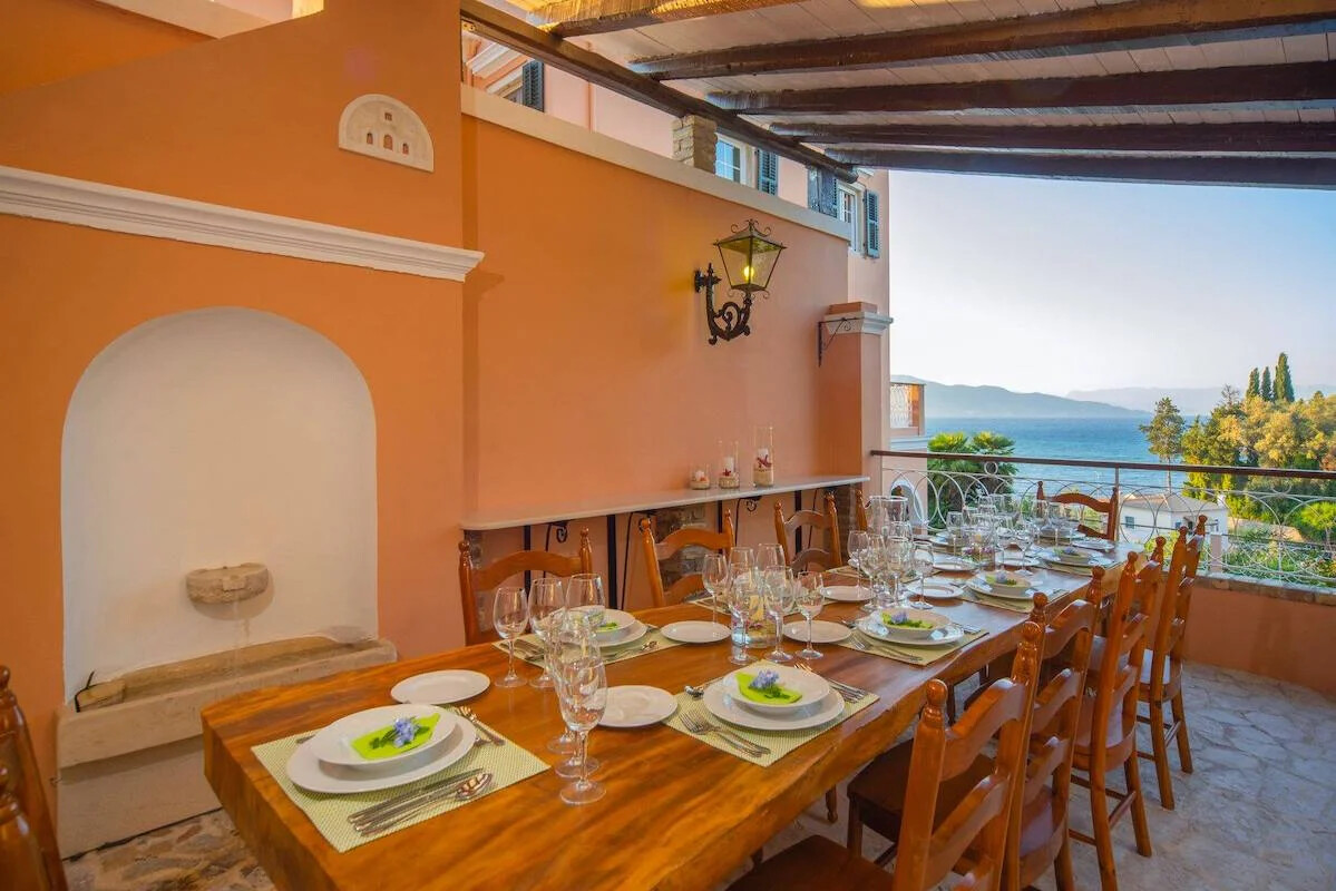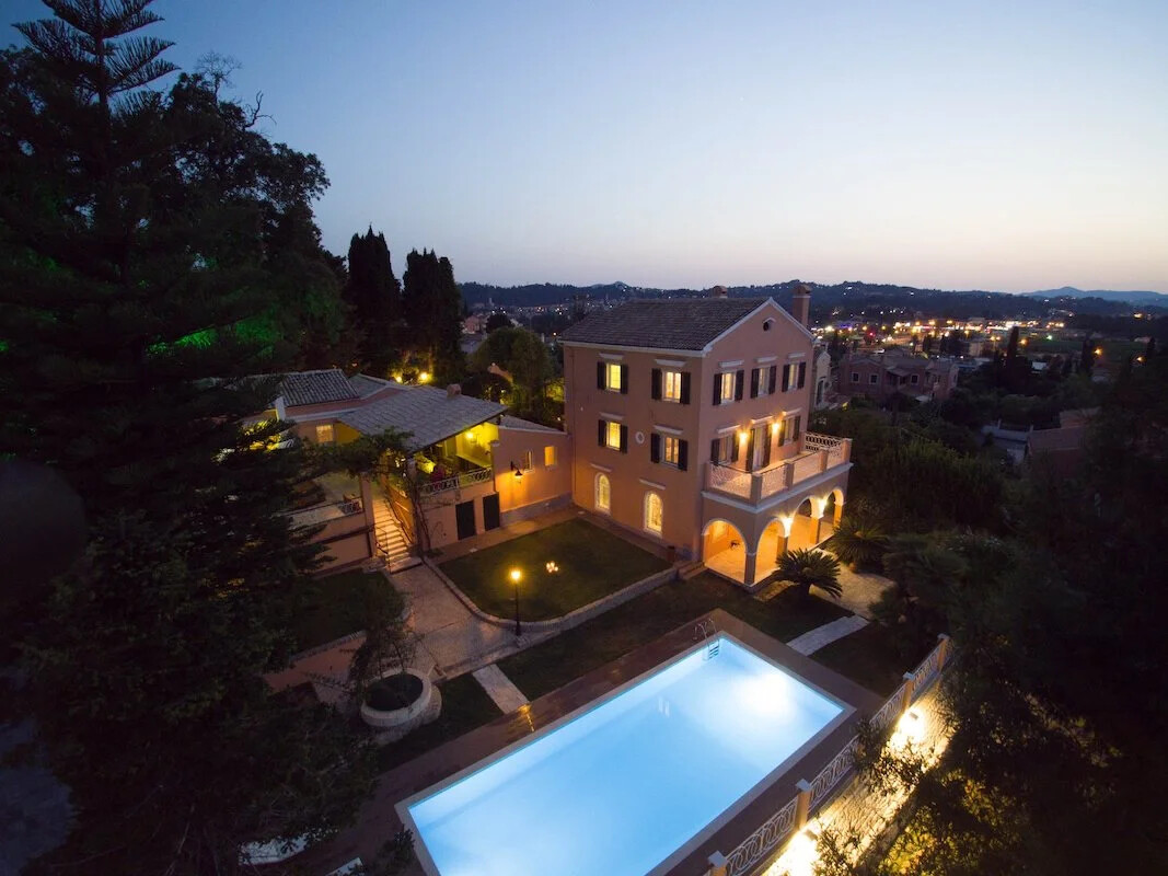 Family holiday villa, is a luxurious traditional Corfiot mansion that was built in 1870 by a wealthy man, of the aristocratic class of Corfu. During the period of British rule, he emerged as a master builder, obtained permission to build luxurious buildings, and built many of the Corfu’s mansions for other noble families. In 1870 he built this mansion for himself and his family on the hill today called “Kefalomantoyko”. He chose the best part of the hill to build it. Later, he distributed the land to the descendants and today the garden surrounding the mansion covers 2 acres!