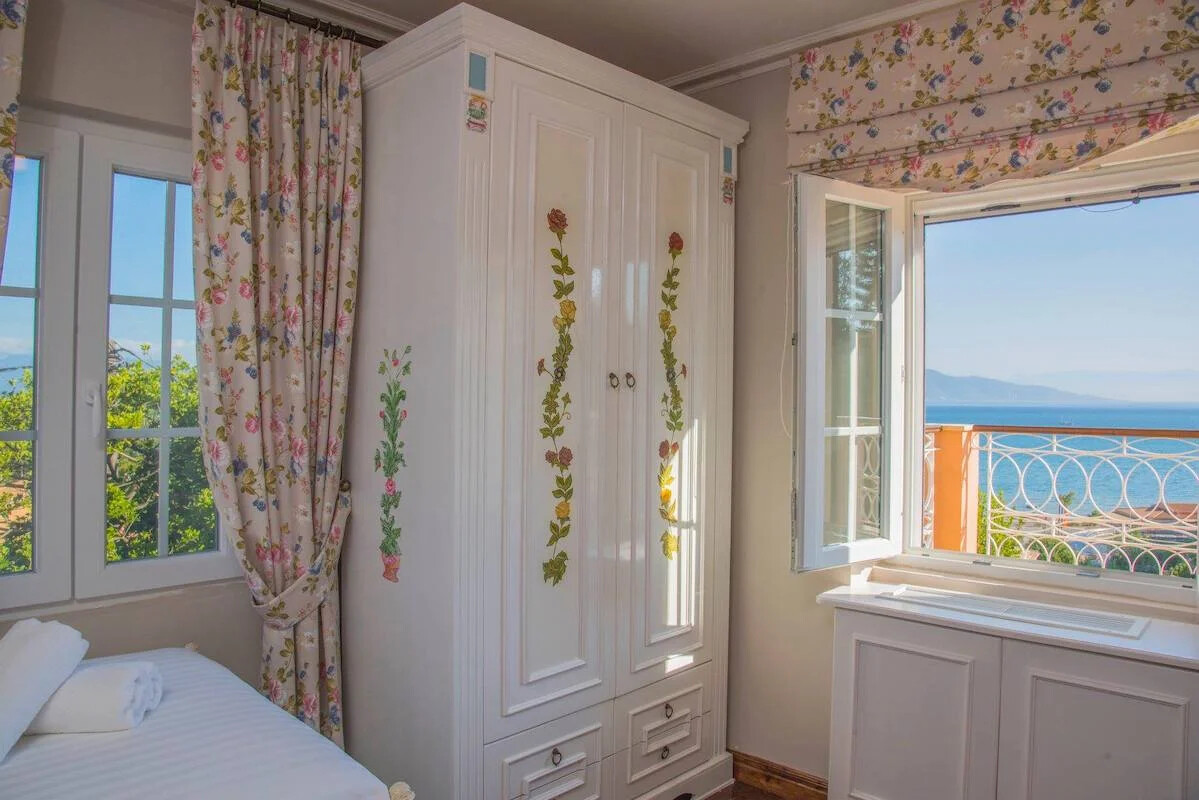Throughout the villa, handcrafted antique furniture, collected from Corfu and distant lands, weaves tales of unique stories. Elaborate, hand-painted wardrobes exude artistry and elegance, capturing the essence of a bygone era.