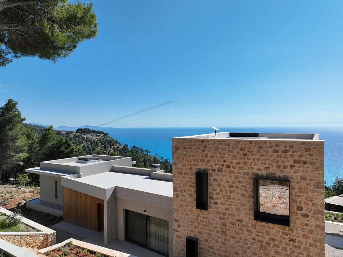 To live at Luxury Villa for sale Lefkadais to experience nature with all senses—to see the absolute blue of sea and sky, to breathe pine-scented air, and to enjoy refined luxury in complete tranquility.
