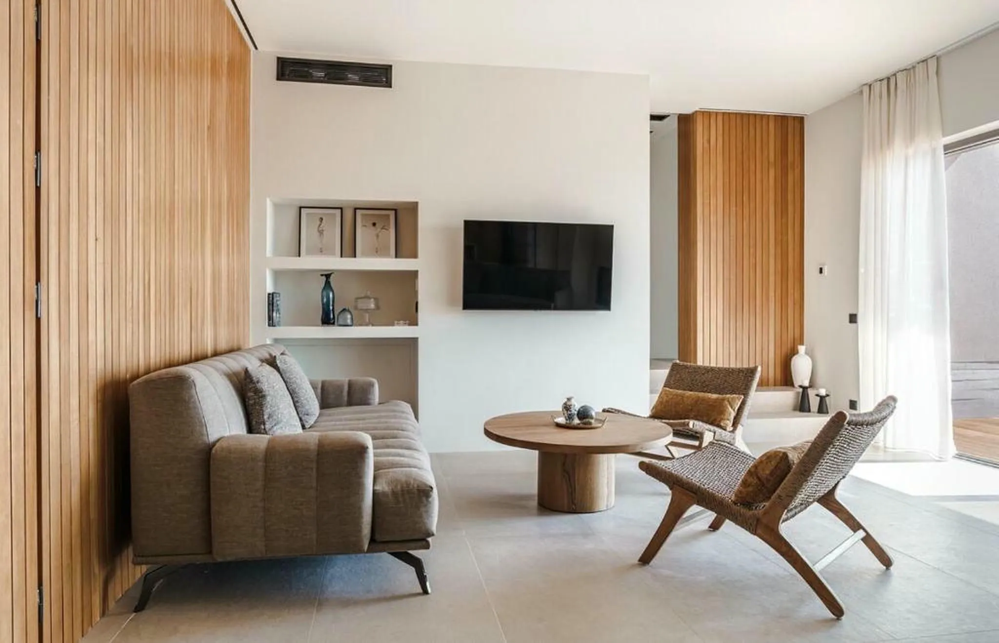 Luxury Villa for sale Lefkada masterfully blends modern architecture with traditional natural materials. Exterior stone walls crafted from local stone and warm wood elements allow the villa to merge organically with its surroundings.