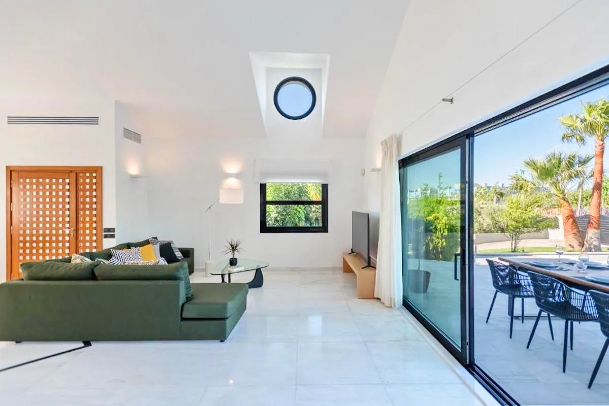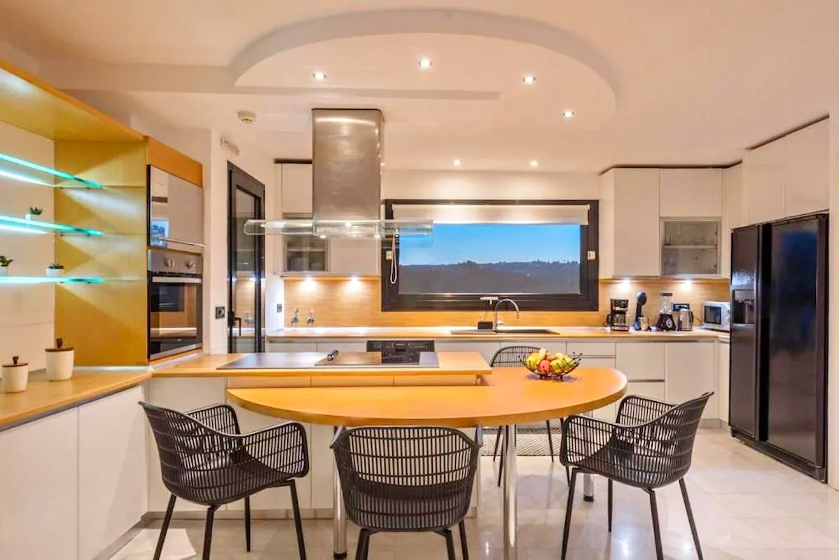Upon entering the villa, guests are welcomed into a large, sunlit kitchen that inspires culinary creativity. The adjacent dining area features a cozy fireplace and a massive smart flat-screen TV, making it ideal for relaxed gatherings. The upper level reveals three modern living rooms, furnished with sleek lines and top-quality materials. An additional office space provides a quiet corner for work or reflection.