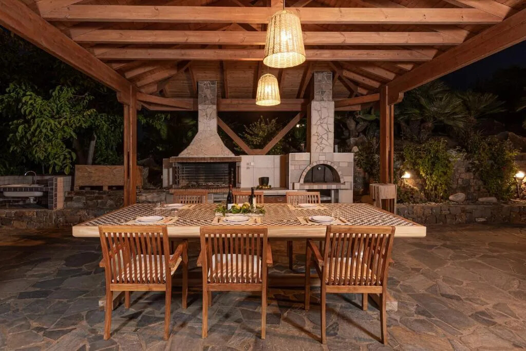 The villa also offers an outdoor fireplace, providing a cozy spot to gather around on cooler evenings. An indoor play area is available for entertainment, pool table, and more. Additionally, guests can relax on the sun terrace and take in the stunning surroundings.