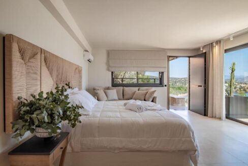 The villa’s minimalist and delicate style perfectly complements the rugged natural landscape, providing a dreamy vacation dwelling. The villa spans three floors, with the entrance on the ground floor leading to a large sitting room where you can relax with your family and friends while taking in the tranquil sea views. The same space includes two en suite bedrooms and a WC. The lower level has a fully equipped kitchen and three additional en suite bedrooms, while the upper floor offers two bedrooms, two bathrooms, and one bedroom attached, all with balconies to enjoy the views.