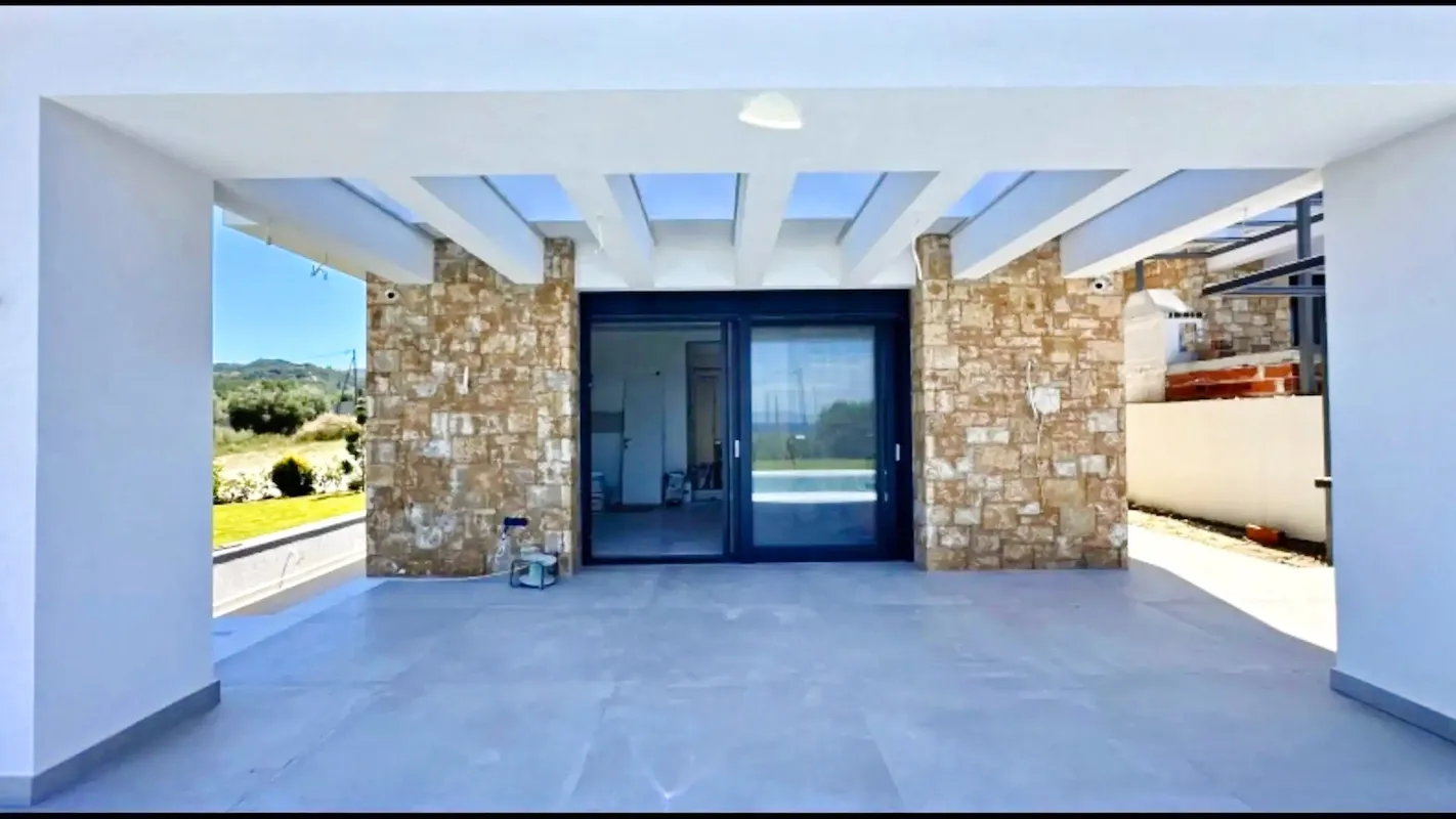 This stunning villa is a perfect fusion of contemporary architecture and traditional Mediterranean elements. The property boasts elegant stone finishes, expansive glass doors, and spacious outdoor terraces with pergolas. The result is a harmonious blend of sophistication and natural beauty, offering breathtaking views of the Aegean Sea.