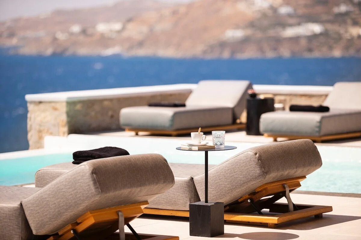 This stunning property boasts 280 square meters of luxury living space and is nestled on a picturesque 1,000 square meter plot within an exclusive complex. It offers breathtaking panoramic vistas of the crystal-clear Aegean Sea against the iconic Mykonian landscape.