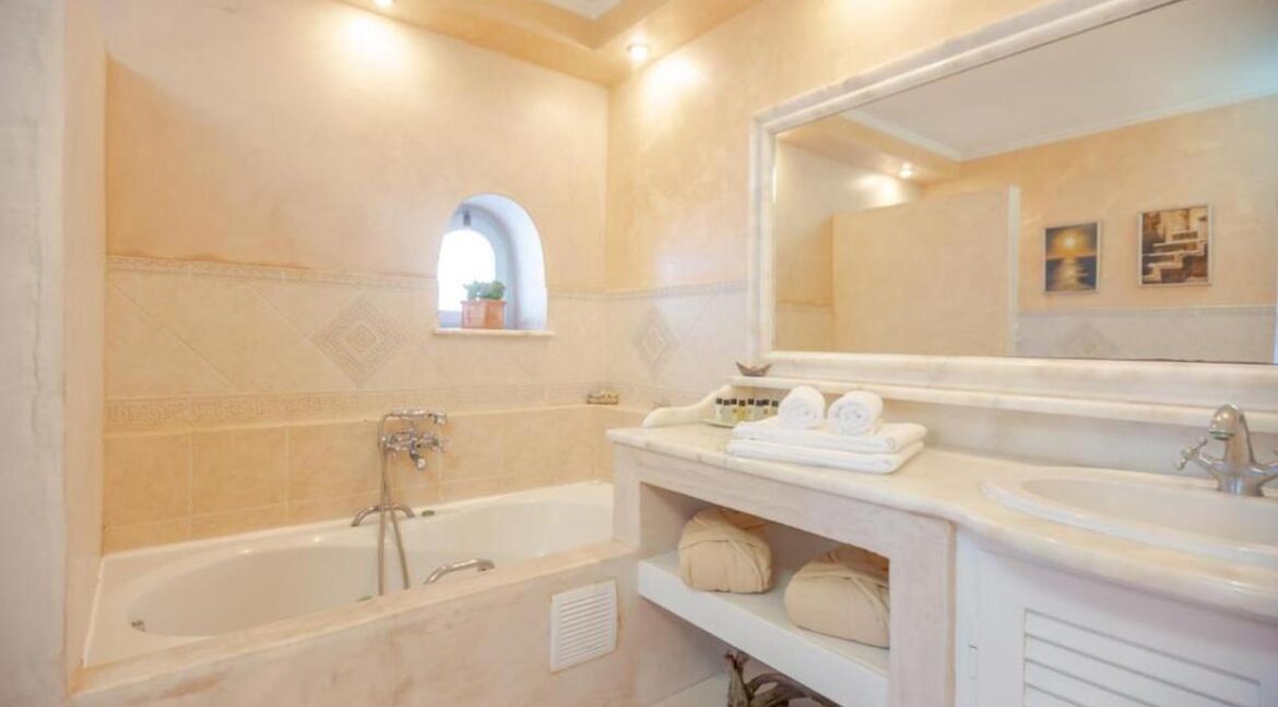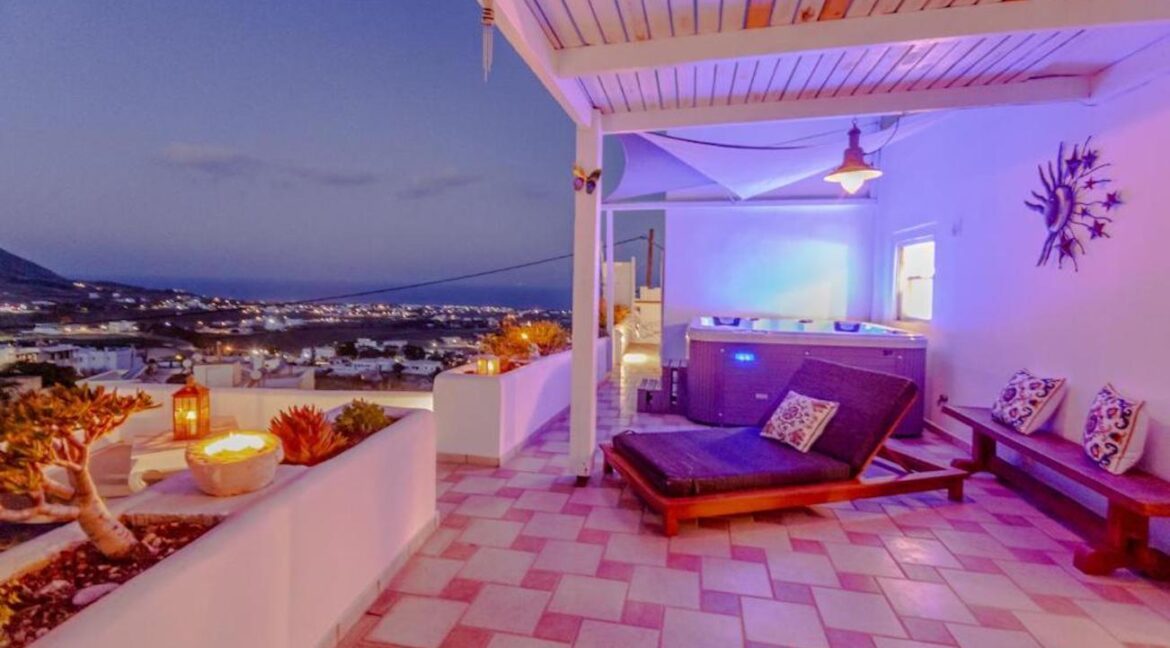 Directly access to the sweet patio, equipped with an outdoor nicely shaped private jacuzzi, enjoying the views of Kamari beach and the overwhelming mountain of Ancient Thera.