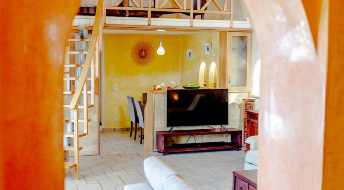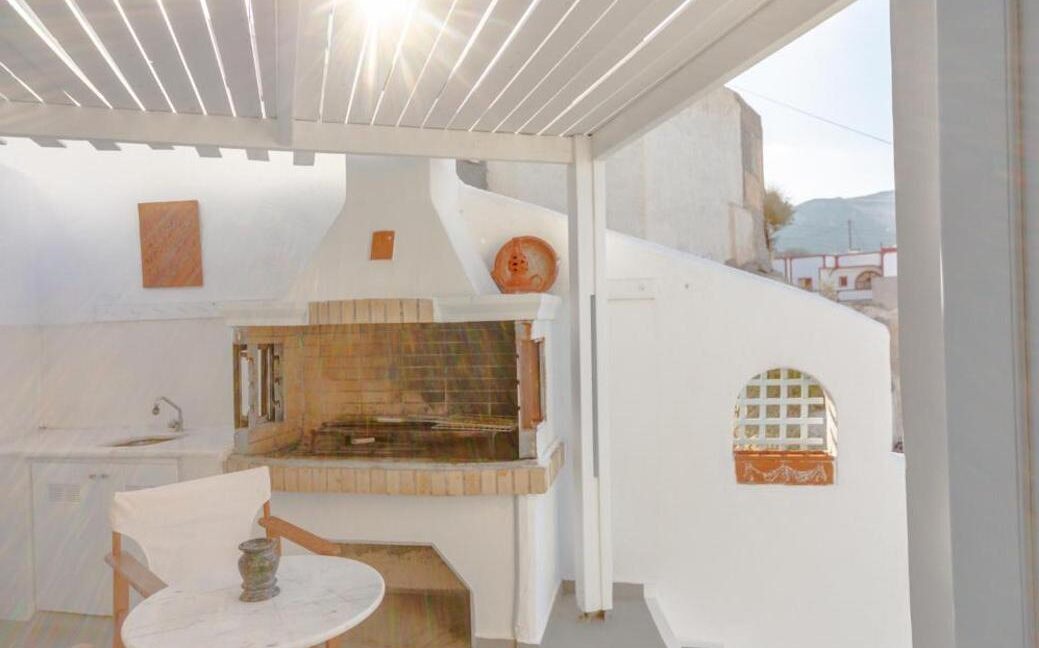 Santorini Exo Gonia : Maisonette 120 sqm on a plot of 600 sqm, fully furnished, 3 bedrooms, living room, kitchen, 2 bathrooms, air conditioning, one closed parking space, bright, sea view, facade, fireplace, terraces, large terraces, garden 520sqm, aluminum frames, screens, floor type tile, separate kitchen, security door, video door entry, luxurious, swimming pool, internal staircase, jacuzzi, satellite connection, internet, west orientation.
