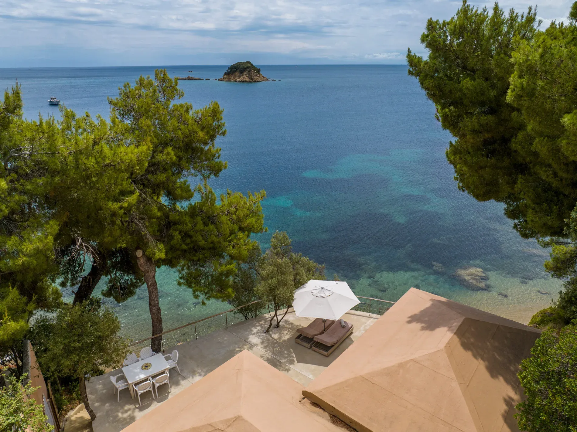 A second, completely secluded beach, shaded by pine trees and accessible exclusively from the property
