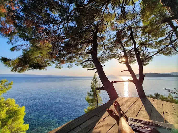 Mornings begin with barefoot walks to the sea. Afternoons drift by beneath pine shade, accompanied by the scent of salt and resin. Evenings unfold on the sunset deck, where the breeze carries the sound of waves and the sky dissolves into gold.