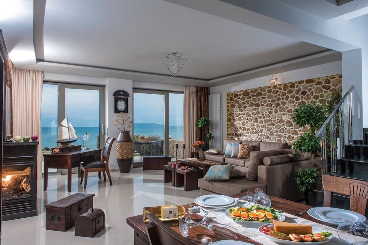 The large open-plan area in the ground floor is sun-light, with large balcony doors that offer endless view to the sea and the veranda. The large corner sofa, the dark wooden dining table, the decoration in classic and colonial style, the stone features that discreetly appear on the walls, the hand-crafted fixtures paint an atmosphere of luxury and relaxation. The presence of the gas fireplace and an Ambilight TV 50’’ dominate the area.The kitchen is contemporary and fully equipped with all the necessary small and large devices and it is separated from the rest of the area by a comfortable bench.