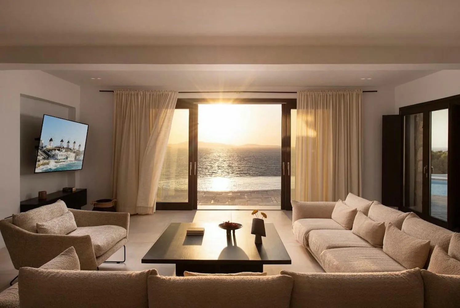 • The villa’s design, with white and beige wall nuances and expansive glass patio doors, allows the vibrant Greek sun to illuminate every corner of the house.