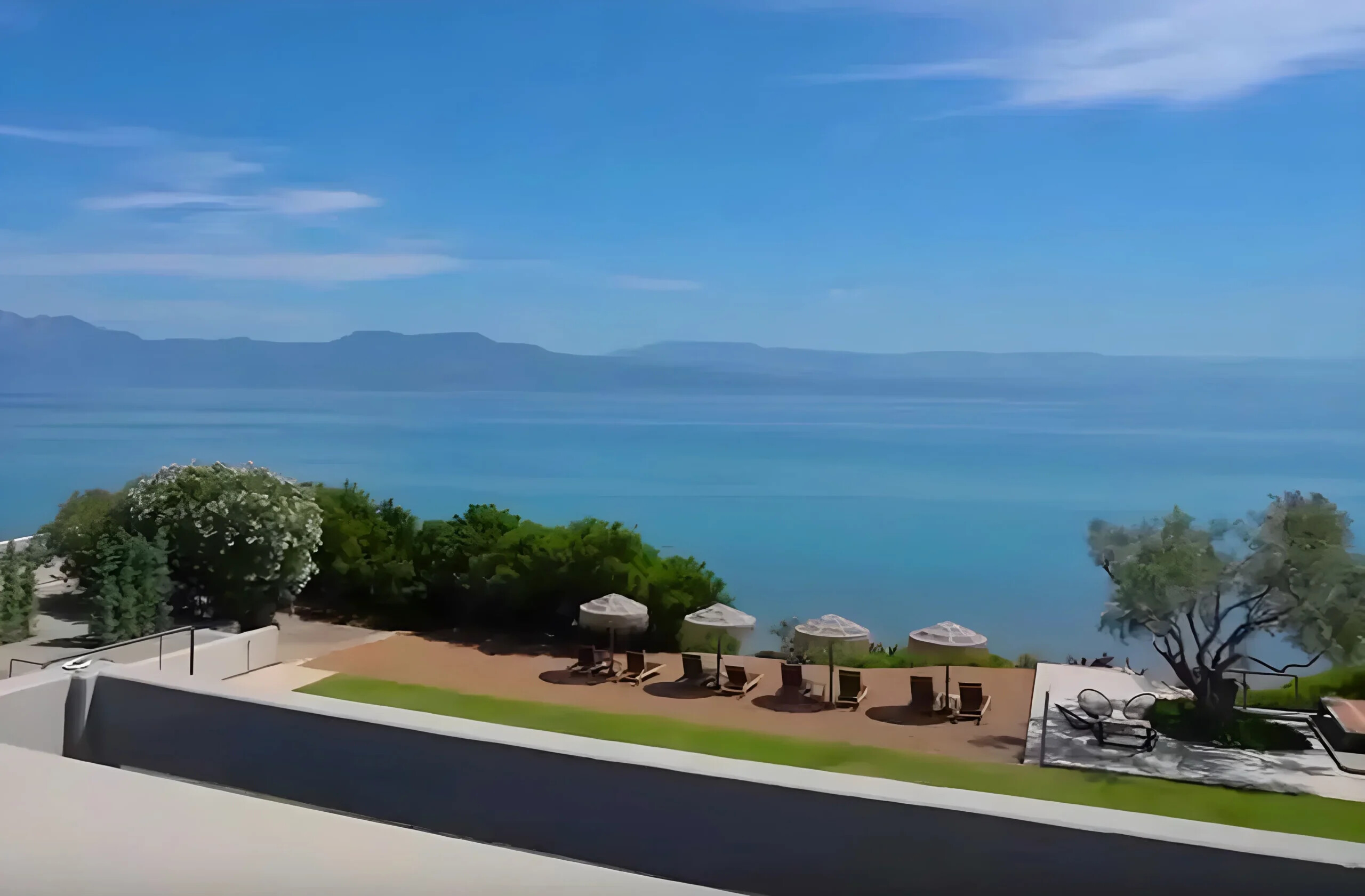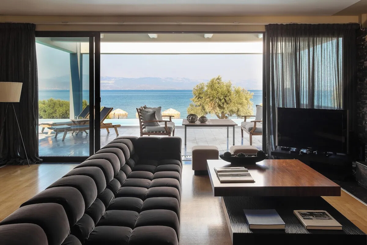 Seafront Villa near Athens is an exceptional seaside property that epitomizes luxury and tranquility along the coast of Evia. With its private beach and seamless blend of natural beauty and modern sophistication, this villa offers an exclusive Mediterranean retreat only 70 minutes from Athens Airport and a mere 65 minutes from downtown Athens. Located near the ancient port town of Anthedon, the villa’s proximity to Chalkida provides residents with convenient access to a bustling city, just 15 km away.