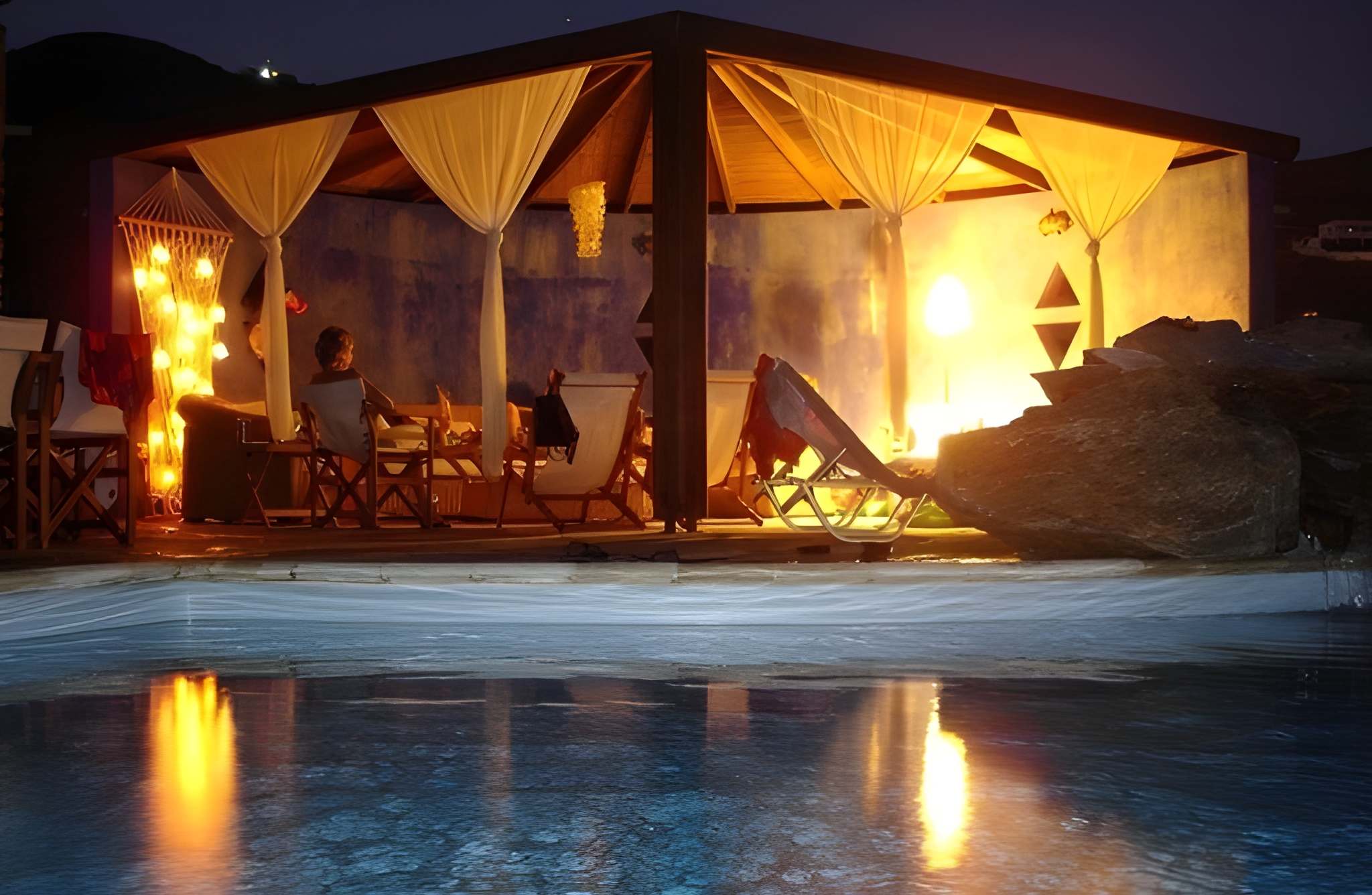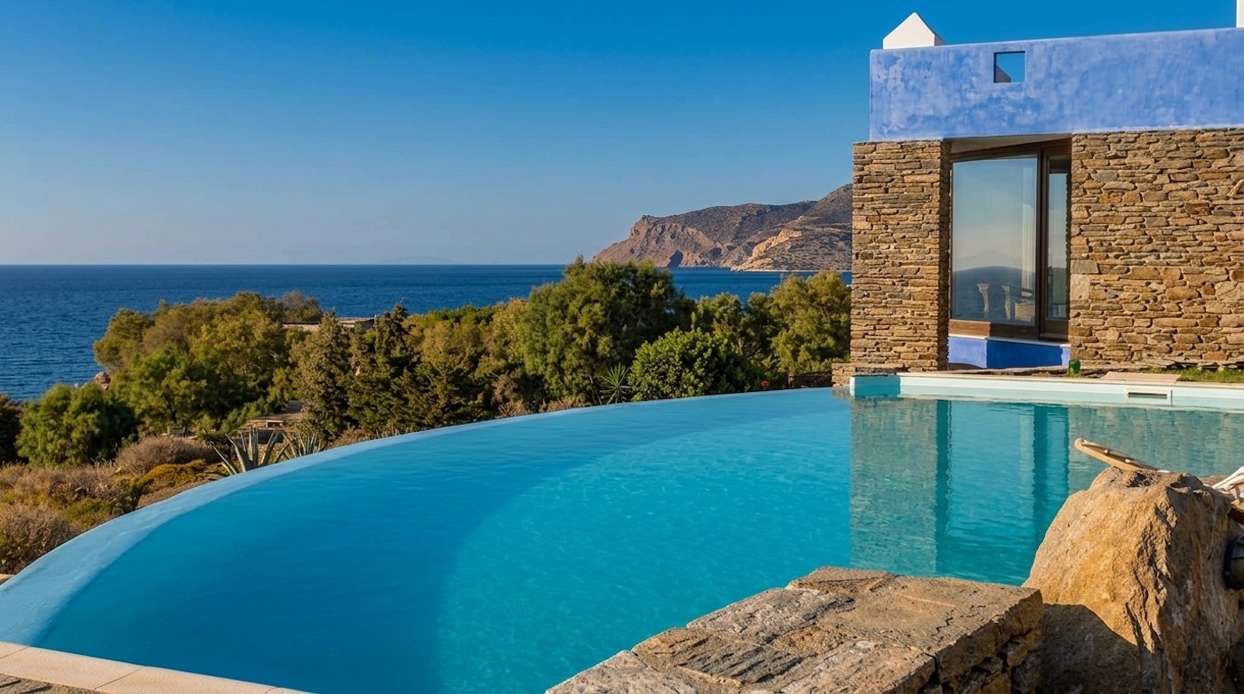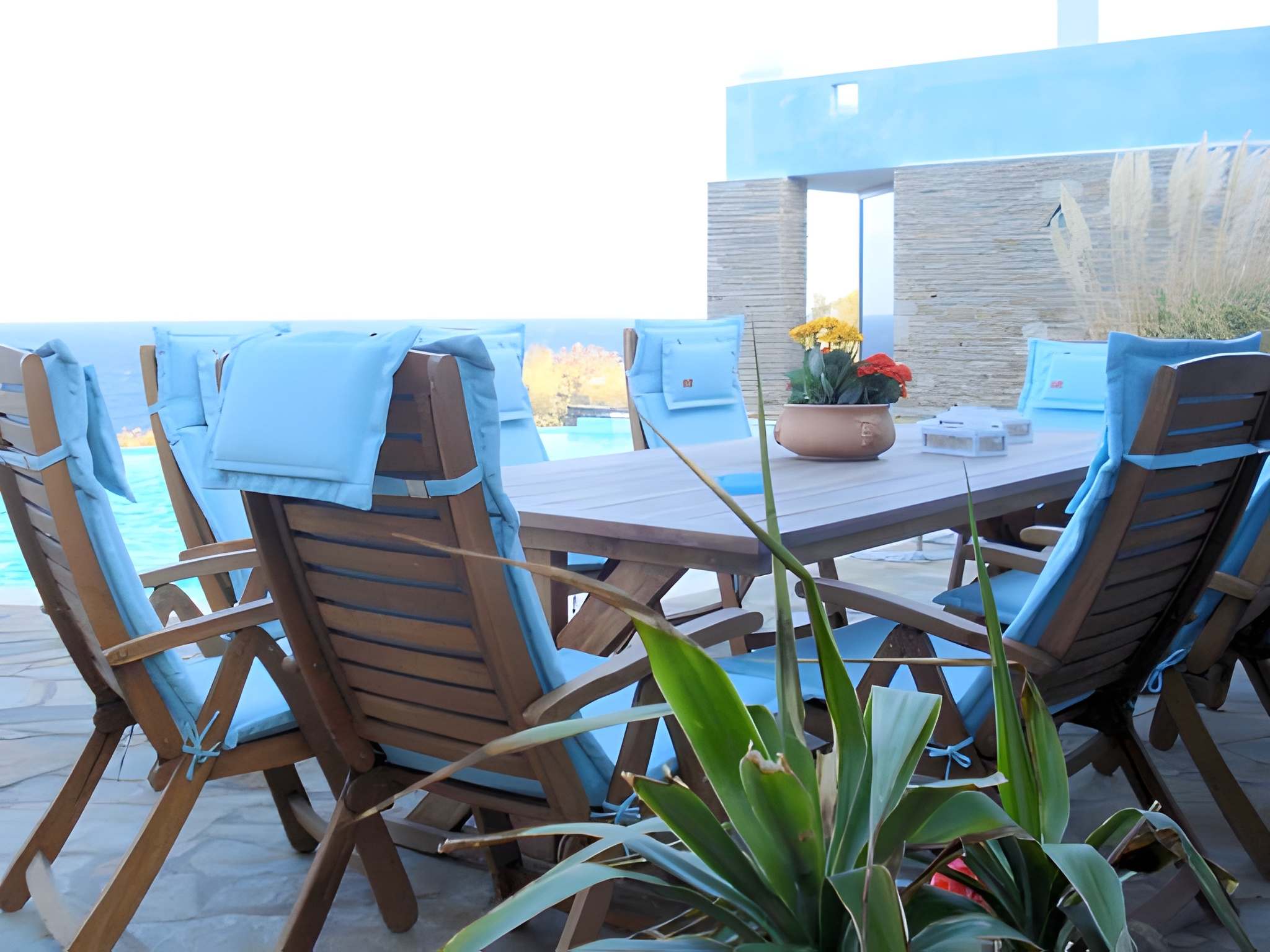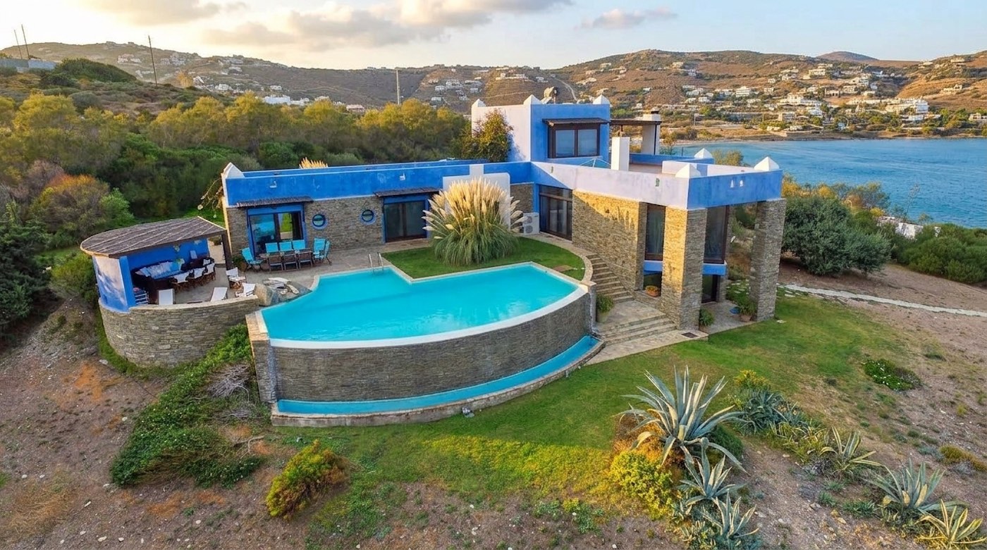 The villa is positioned on a large private estate and provides immediate access to two seaside spots, allowing residents to enjoy both the private pool and the crystal-clear waters of the Aegean.