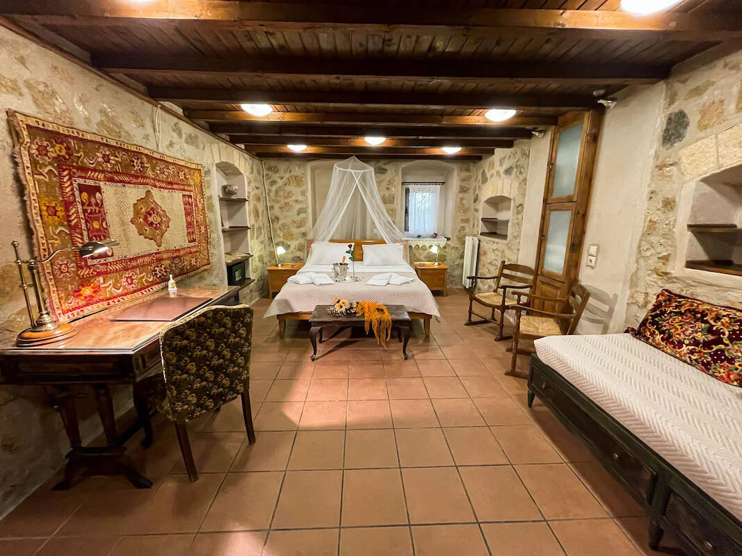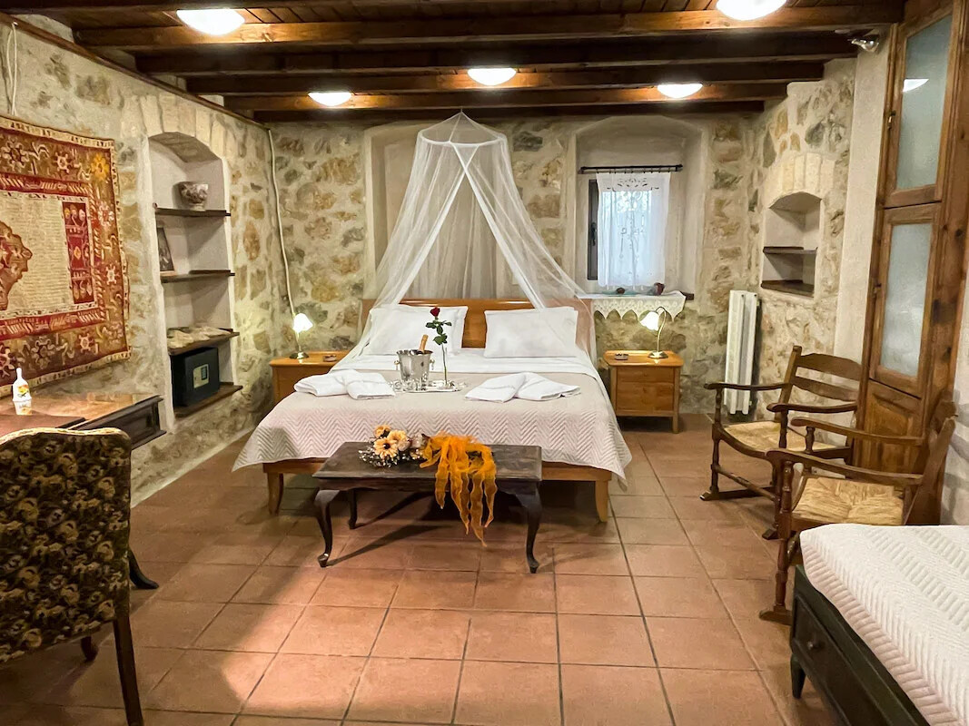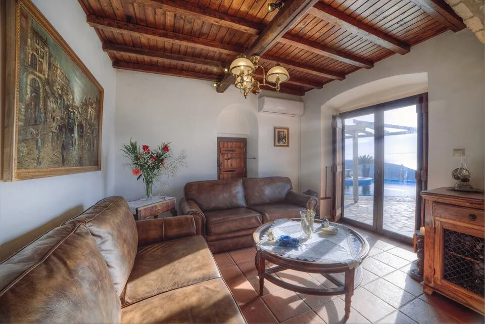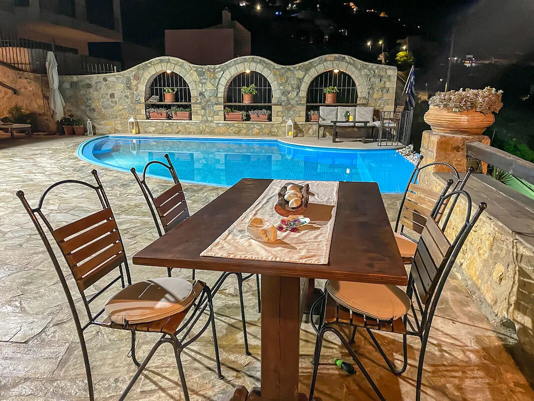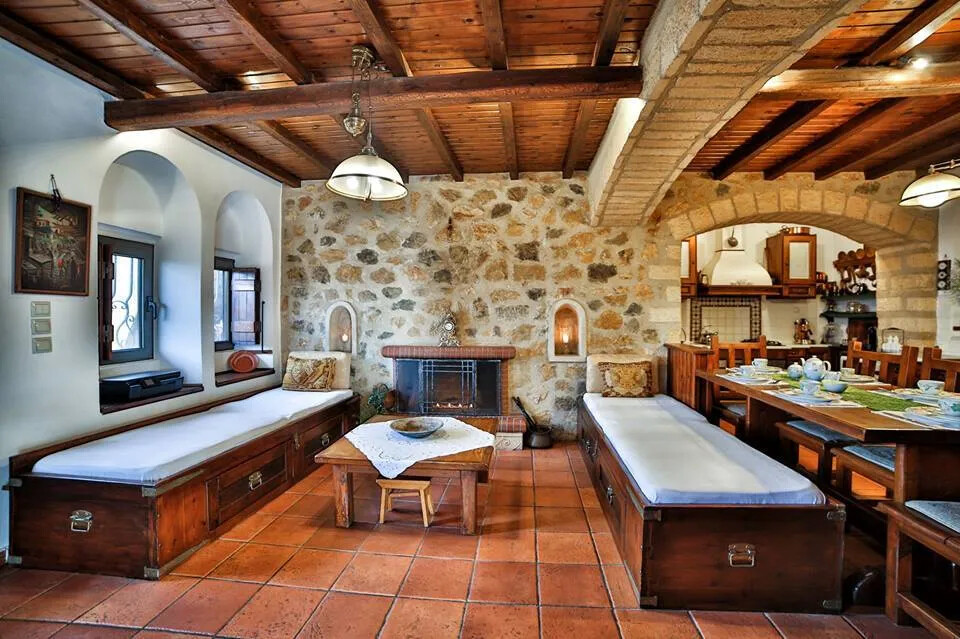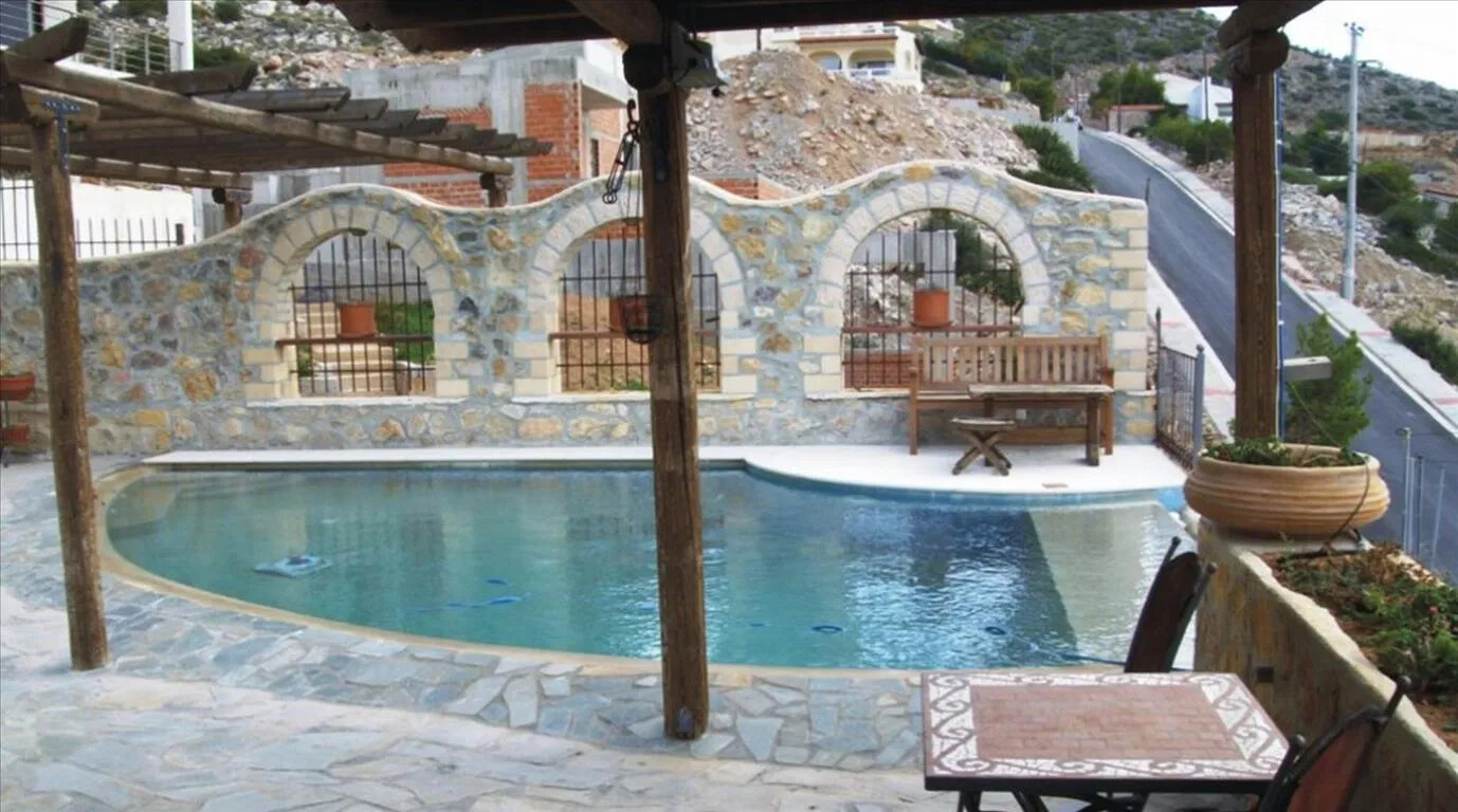 Extras accompanying the property include a parking space and garden, along with a private swimming pool. Situated in the Saronida area, this villa showcases meticulous handcrafted stonework and features five bedrooms. The main house boasts a fully organized kitchen with a 6-seater table, a fireplace with two additional beds, and a living room with leather couches overlooking the pool. Poolside amenities include a large bed, a 6-seater table, couches, and pool beds. An in-rock gas BBQ with an 8-seater table is located outside the kitchen.
