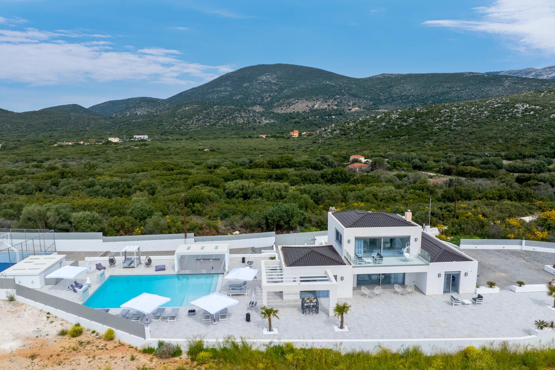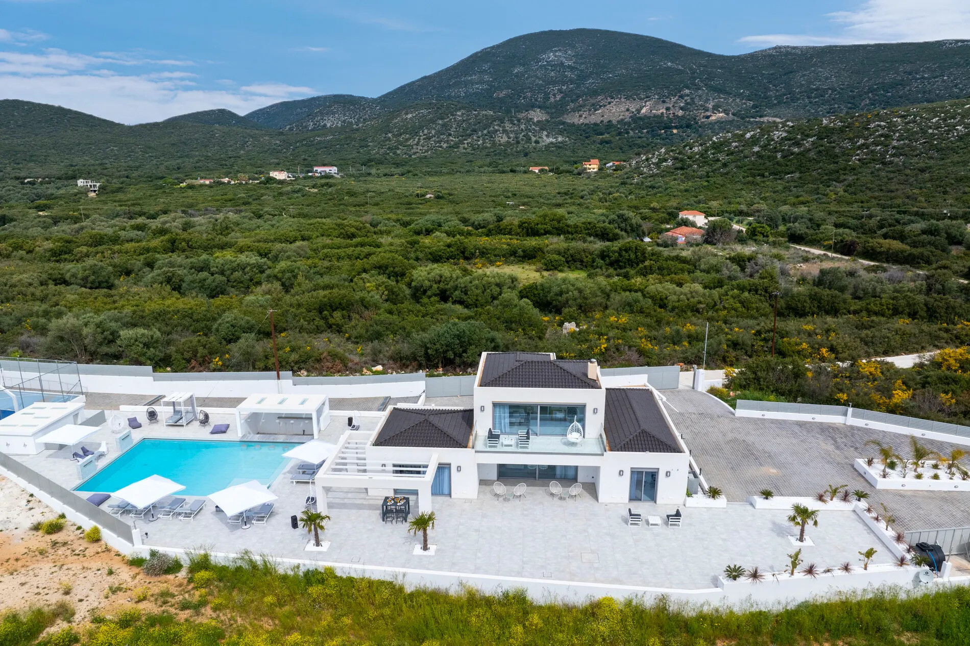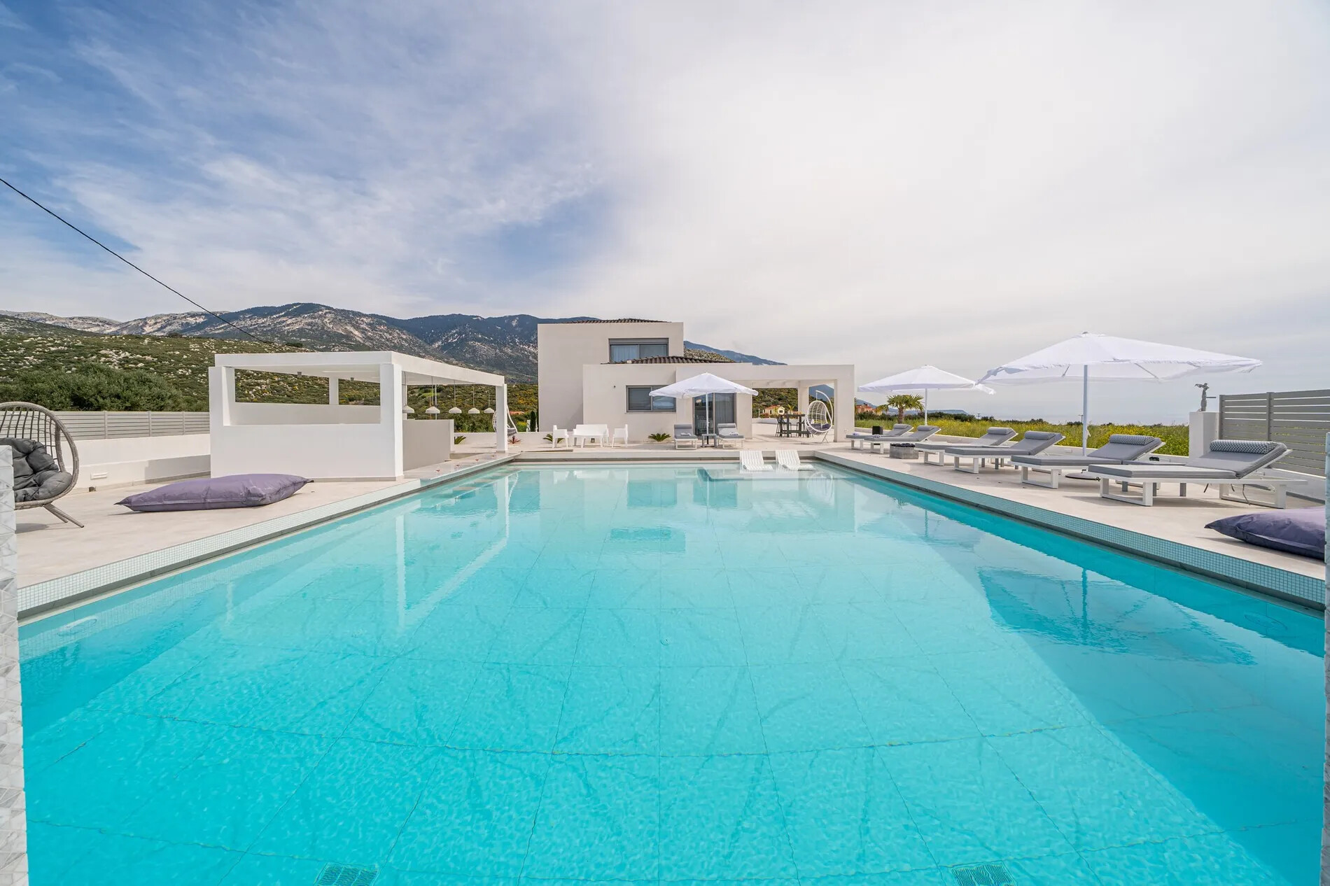 Combining minimalist design with refined luxury, the villa offers breathtaking views of the sea and the island of Zakynthos. With floor-to-ceiling windows, pristine white interiors, and seamless indoor-outdoor living, it is the ideal sanctuary for relaxation, entertaining, or year-round living.