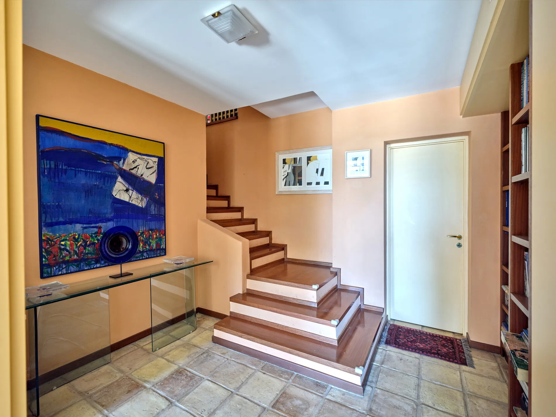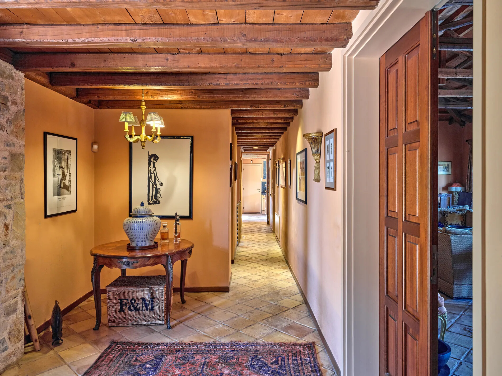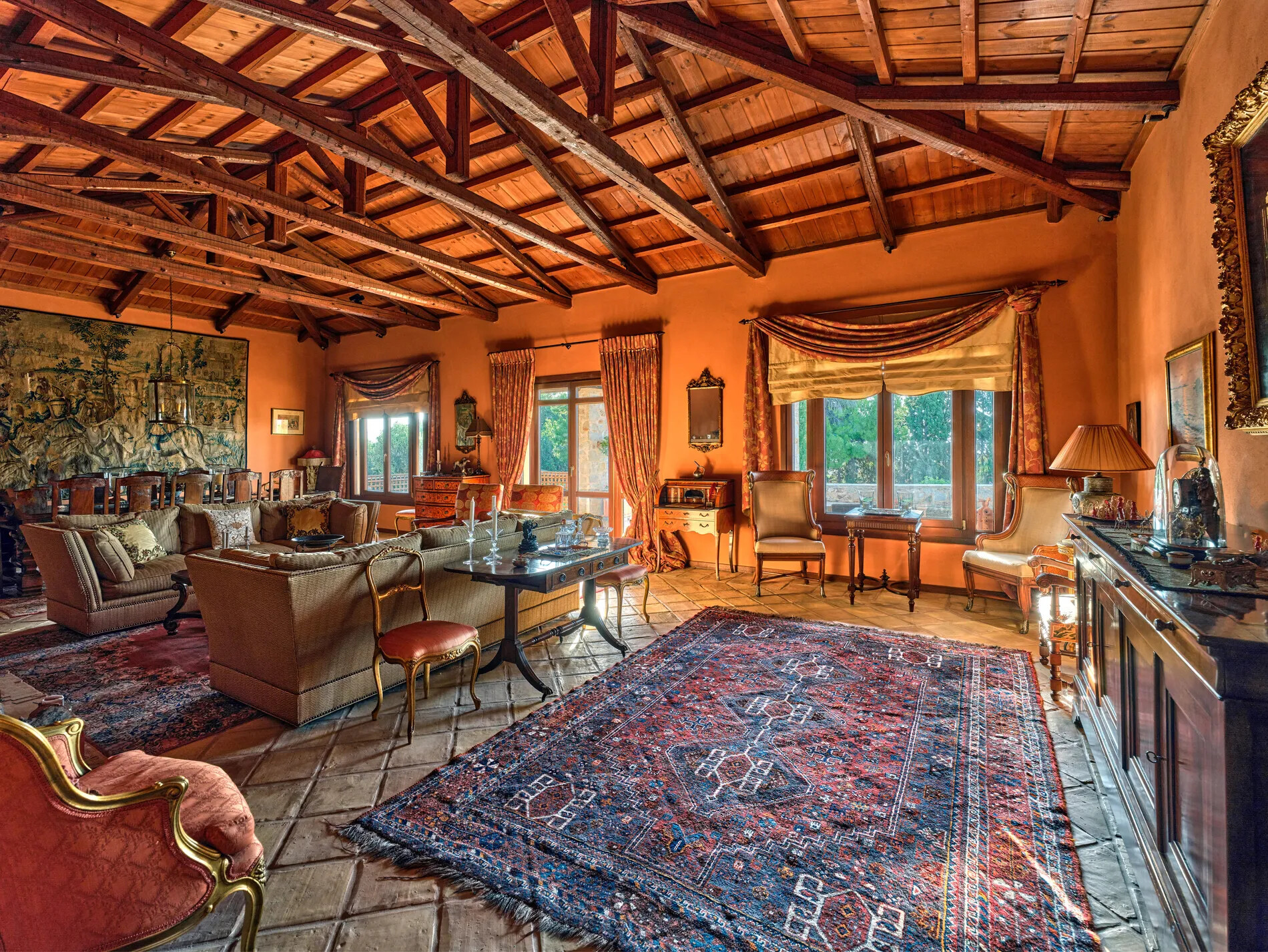 Entrance to this spectacular property is through sprawling, two-acre grounds, featuring a covered entrance with a double-leaf front door adorned with meticulously crafted exterior stonework. The sloping tiled roofs and expansive gardens evoke a country feel, creating a serene ambiance.