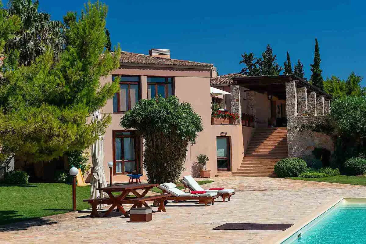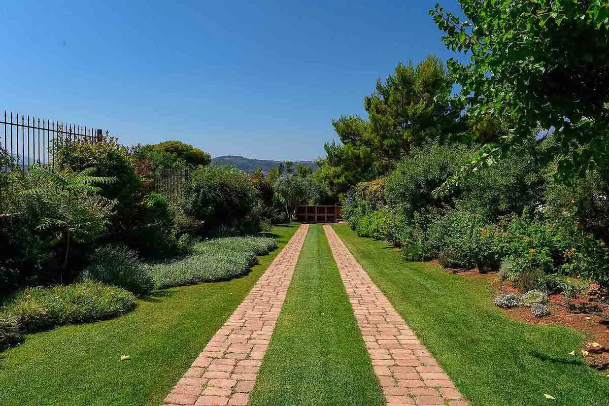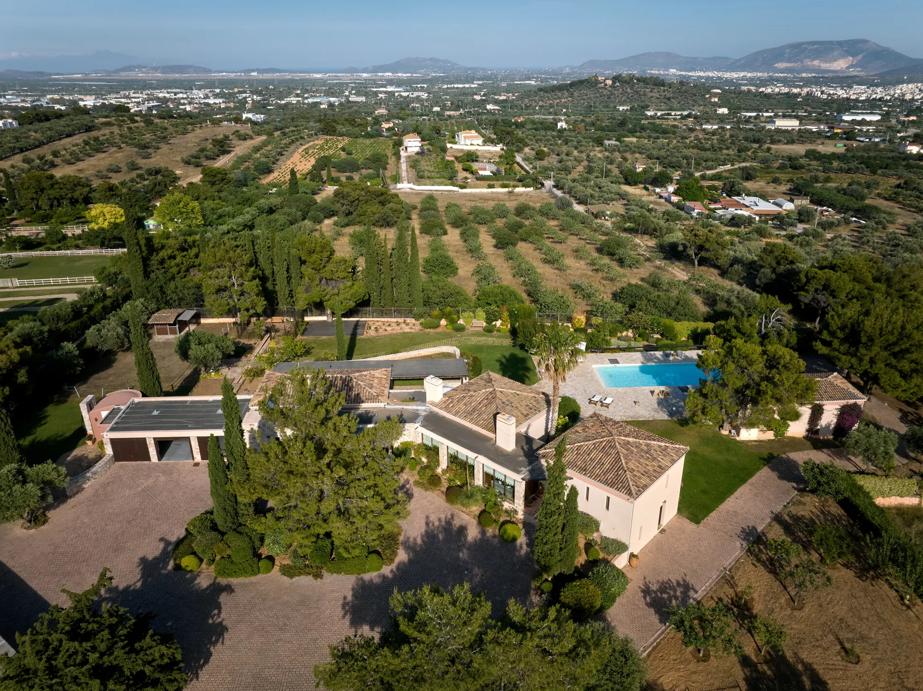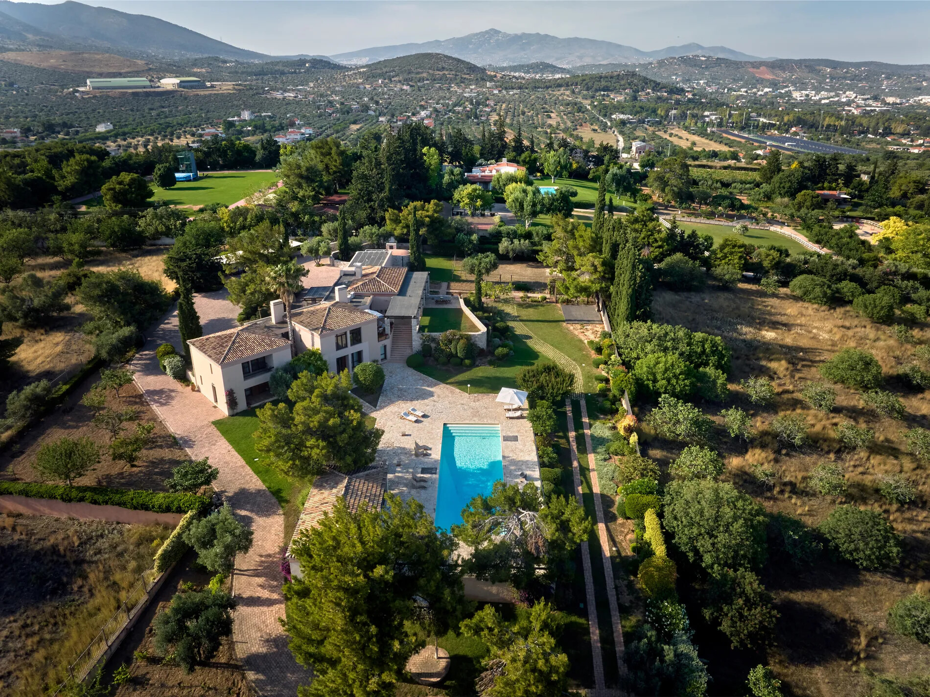 Spectacular villa in Athens caters to equestrian enthusiasts with a small barn and a picturesque riding field, providing an ideal setting for horse owners and riders.