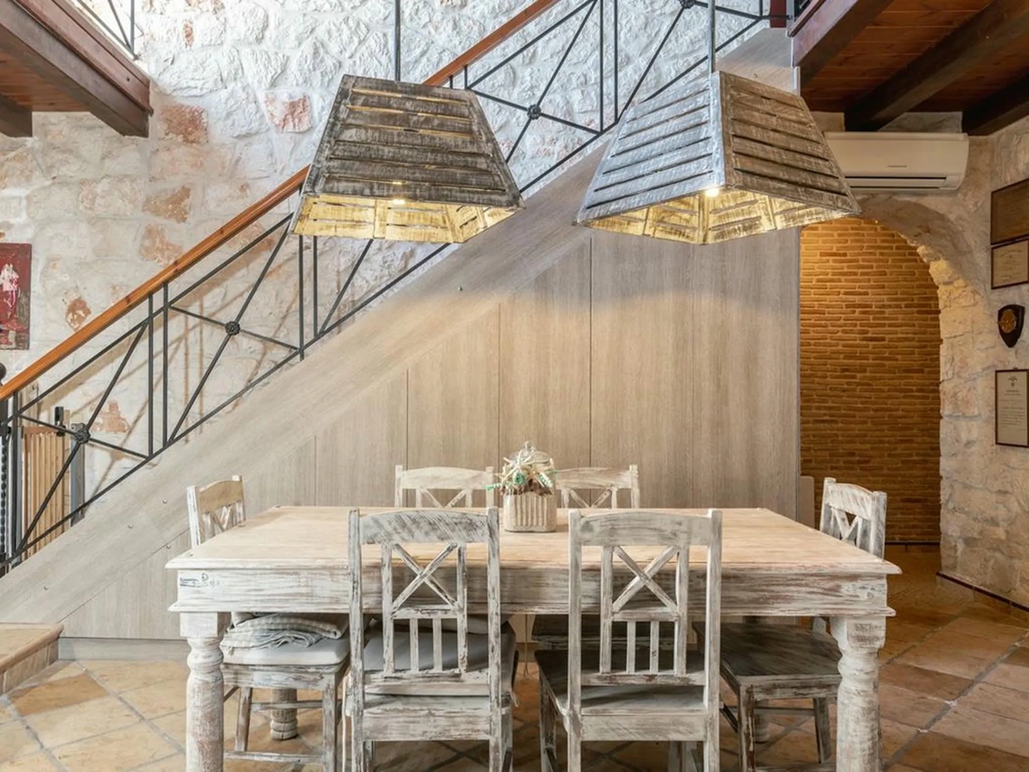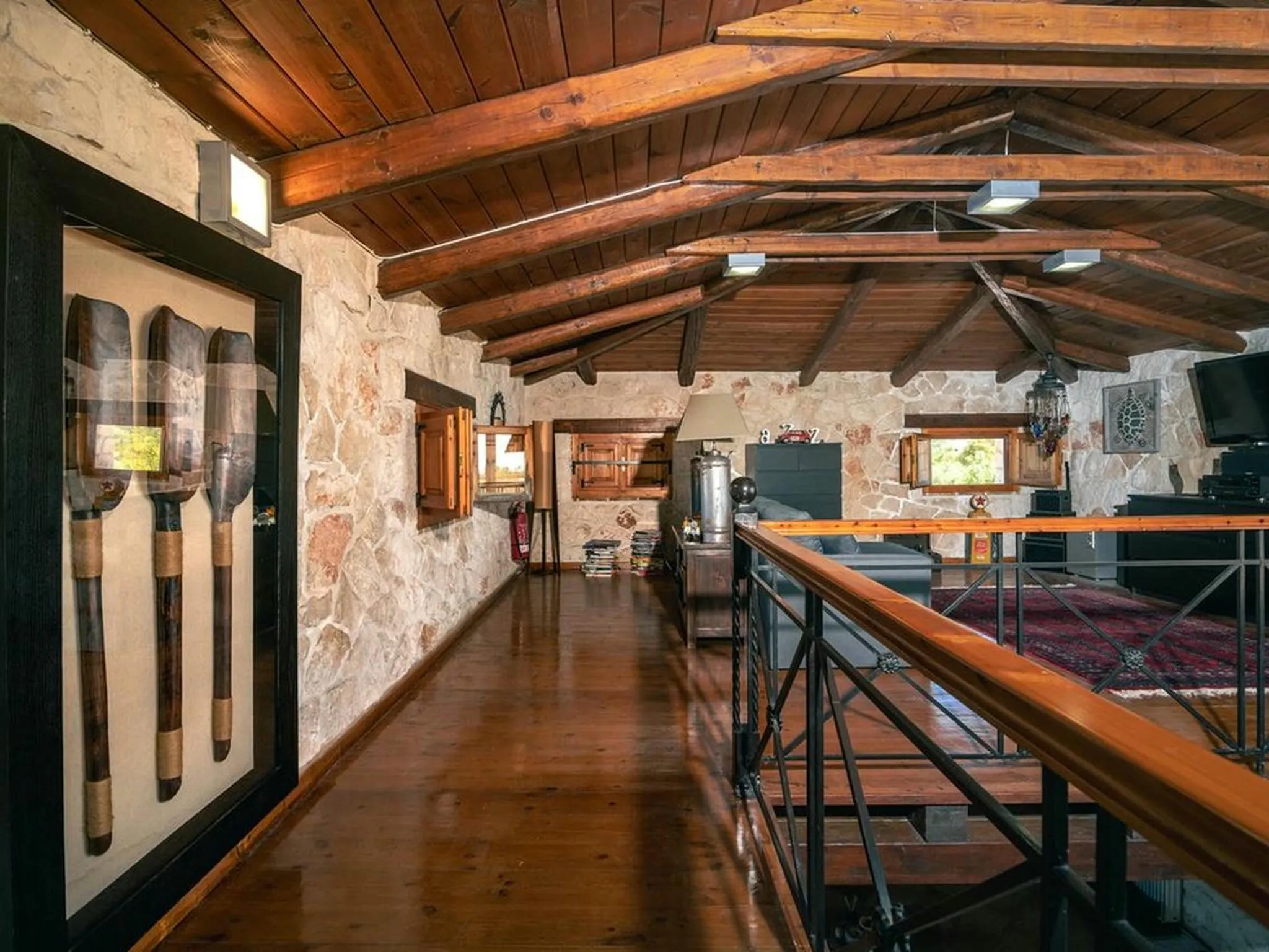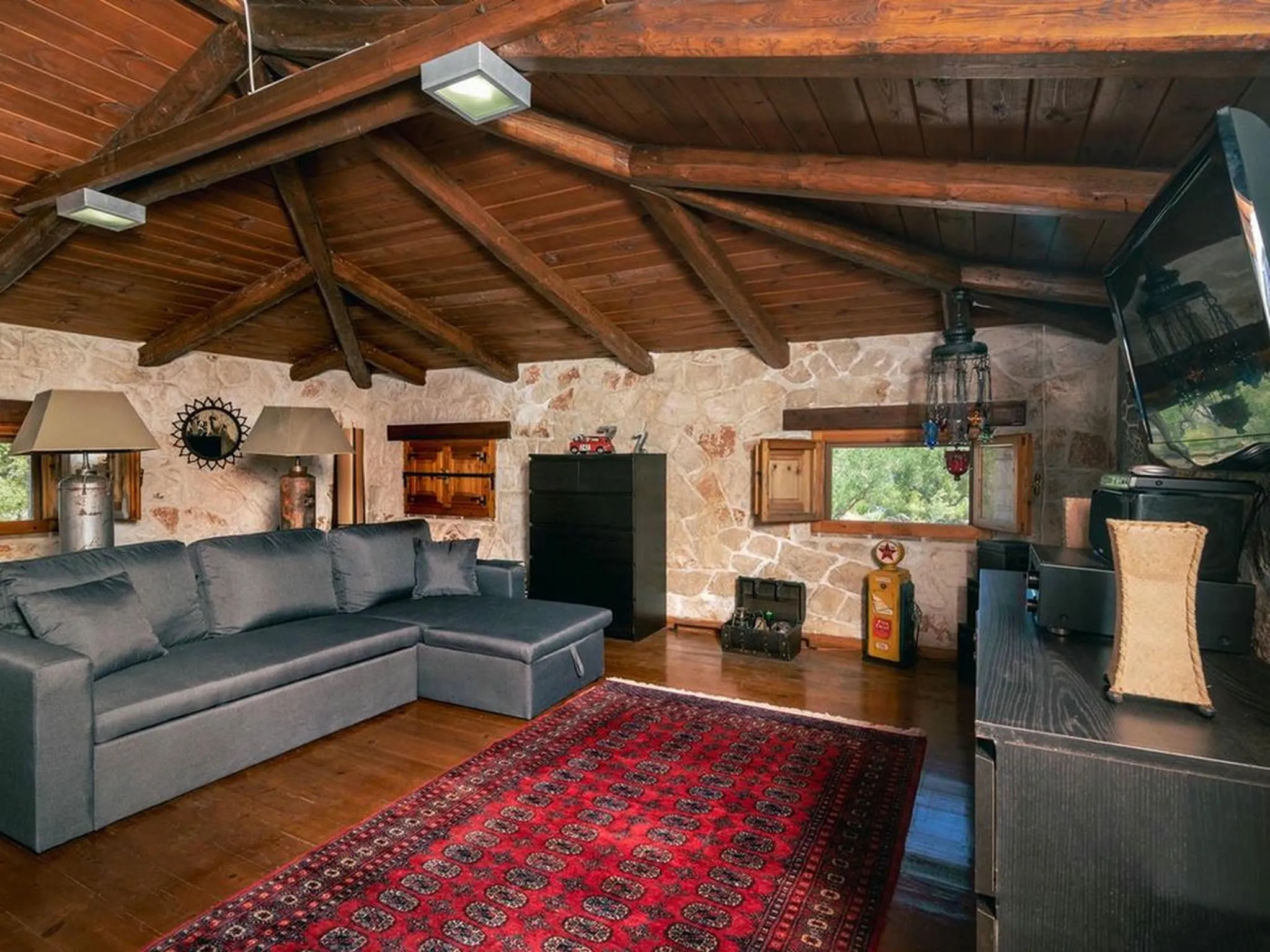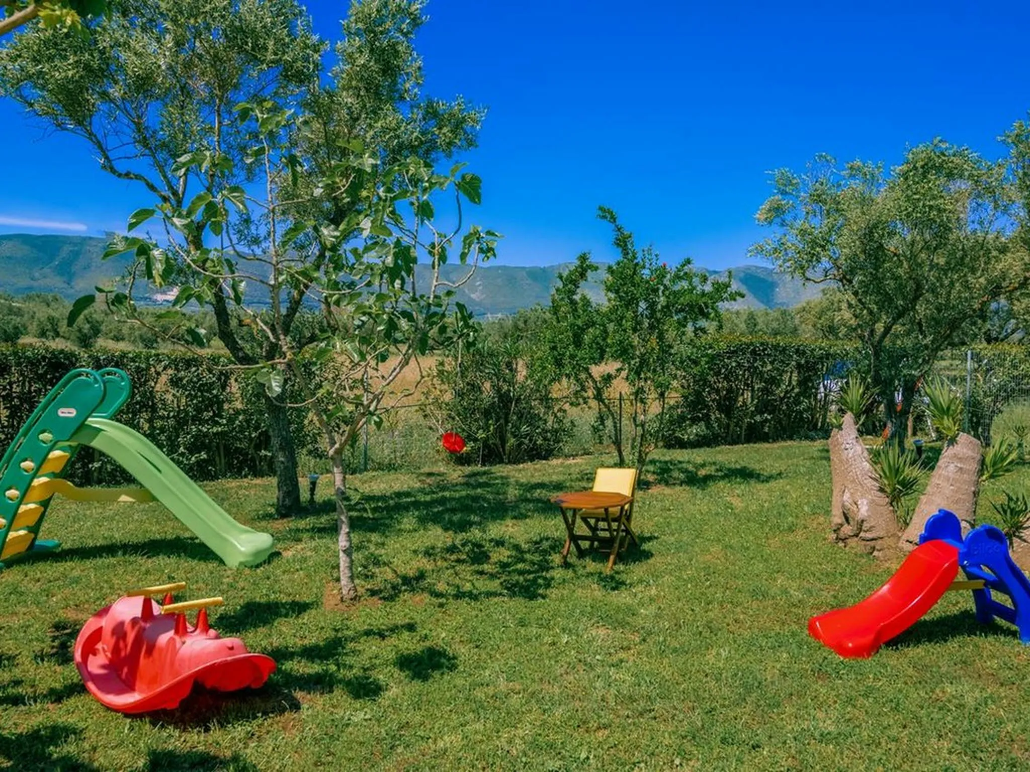 The outdoor areas include paved courtyards, a large garden with swings and children’s play equipment, as well as a wonderful treehouse with a zipline. Additional features include parking, electric BBQ, air conditioning, solar water heater, autonomous heating, and an outdoor dining area.