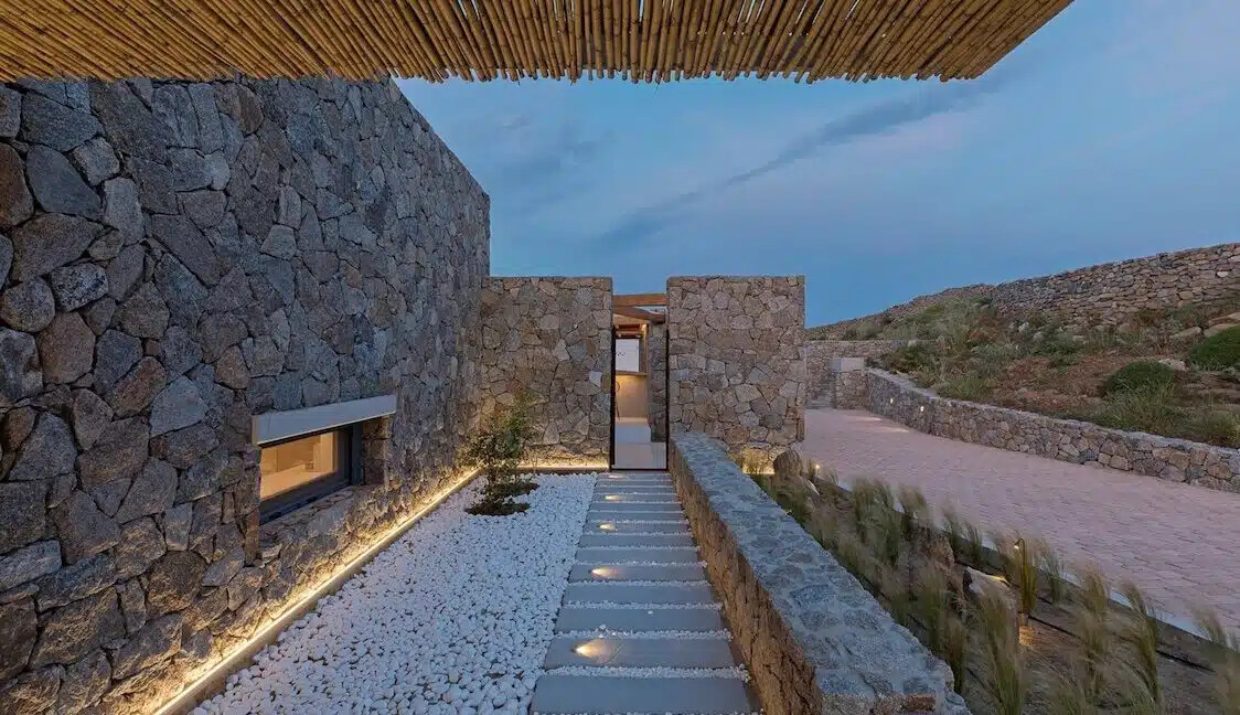 The two buildings are linked with a shared open air terrace which will be the main collective space for the complex. There large pool is located on the centre and uses such as bar, dining, outdoor lounge are scattered around. There have also been designed a bbq and additional lounges. The high stone walls built on the back of the terrace act as a barrier to the strong winds coming from the north, protecting in the best possible way the pool and its uses. This barrier in that way becomes the linking corridor between the two buildings (main villa and guest house) and at the same time acts as a divider between the outdoor spaces and the service road. There have also been designed a housekeeper’s room and a fully equipped gym all located underground together with other rooms for facilities.