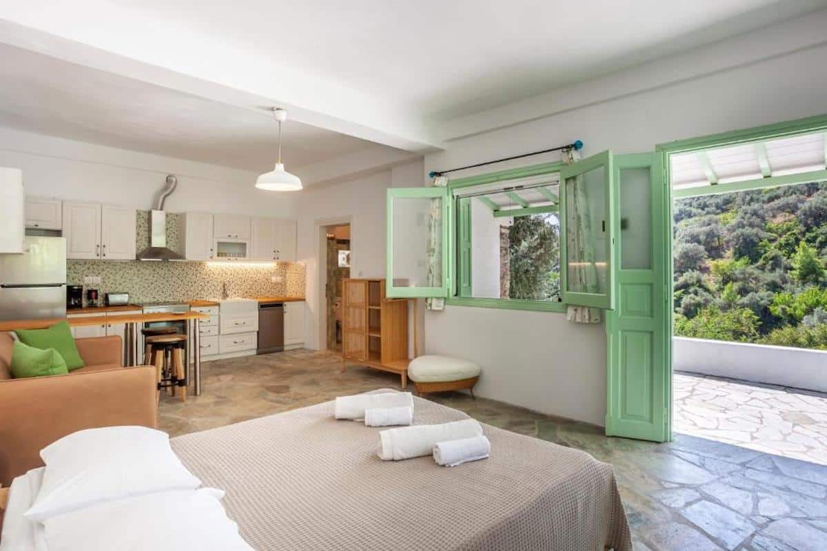 The villas are located near to Glossa(the second largest town on the island), at the area of Agioi Anargiroi. They are independently used, each of them has its own bathroom, kitchen, balcony, and view and share a swimming pool and the garden.