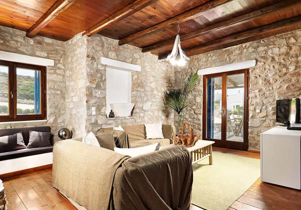 Stone and wood are widely present both indoors and outdoors of the villa. The warm shades of wood paneling combine beautifully with the rough stone walls while the dazzling sunlight and cosy atmosphere conducive to full enjoyment of the wild Cycladic landscape. Cyclades Greece.