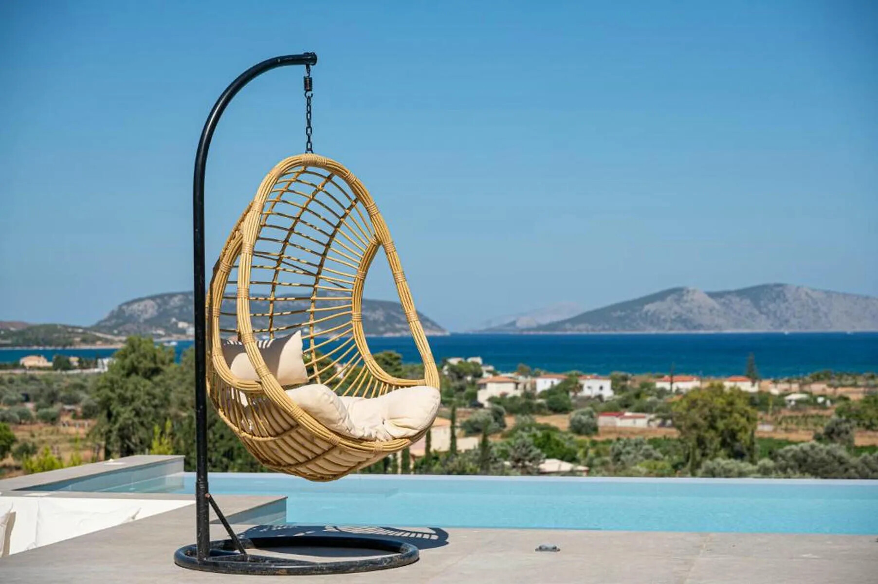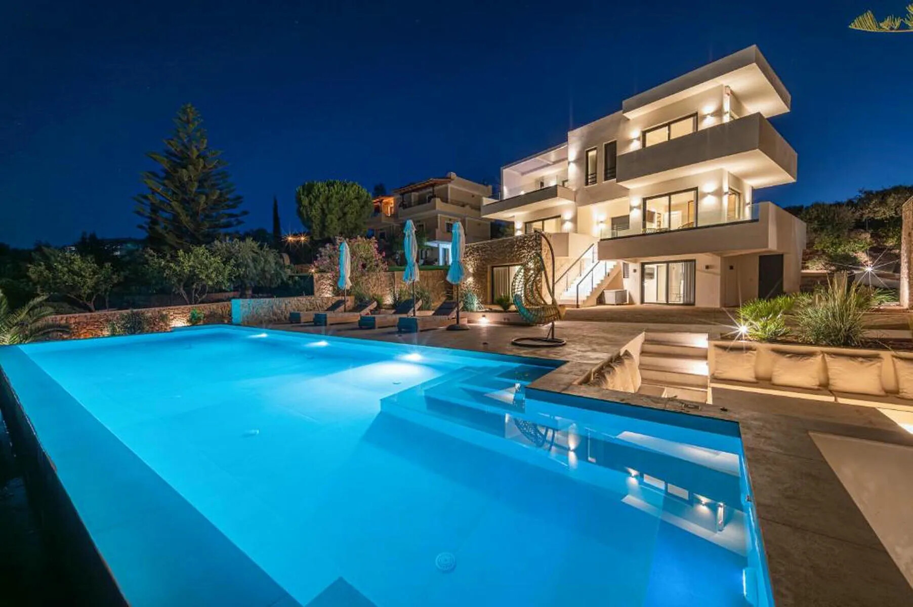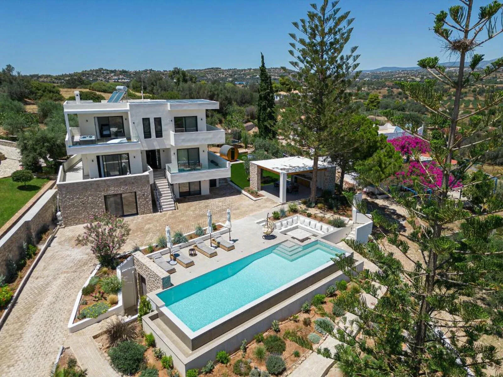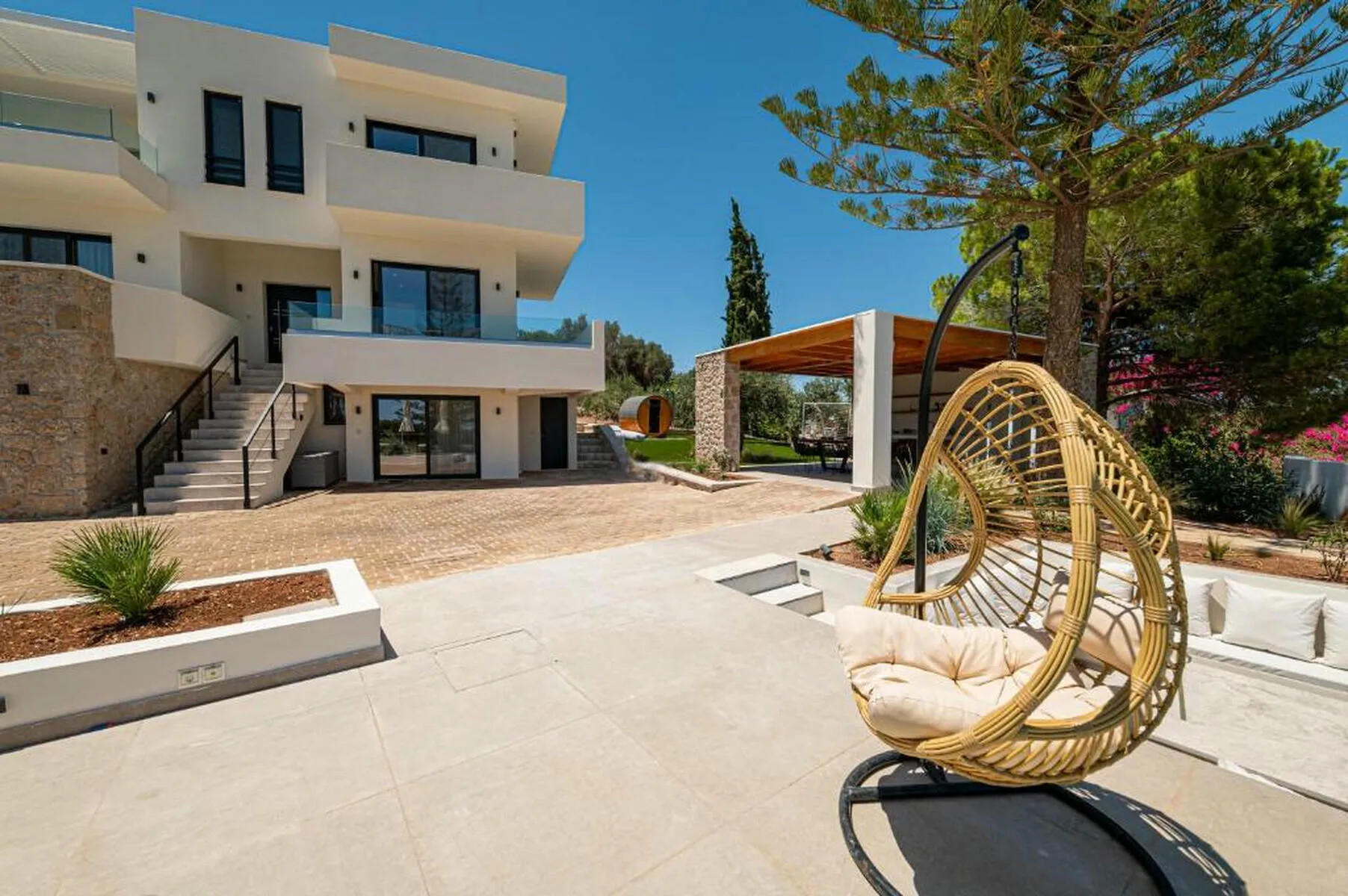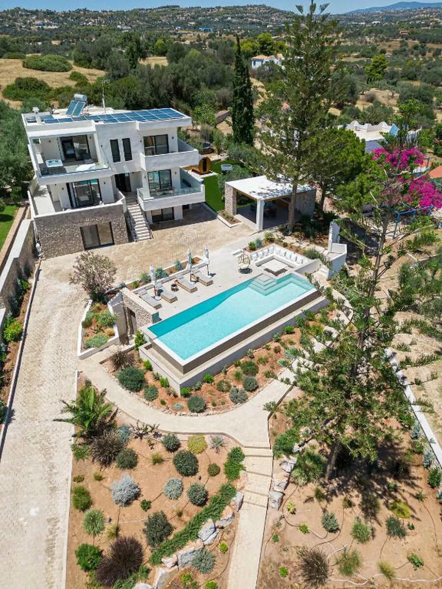 The exterior of Villa For Sale Petrothalassa Porto Heli is equally impressive, designed to provide the ultimate setting for relaxation and entertaining. The stunning swimming pool is the centerpiece of a beautifully landscaped garden, accompanied by: