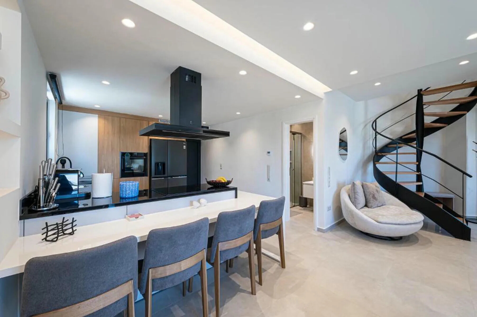 A grand staircase leads to the main entrance on the first floor, where natural light and a warm ambiance welcome you. On the right side, a stylishly appointed bedroom offers flexible use as a guest room or private retreat, with a chic bathroom located nearby. To the left, an open-plan living area and a sleek modern kitchen combine to create an inviting environment ideal for both daily living and entertaining.