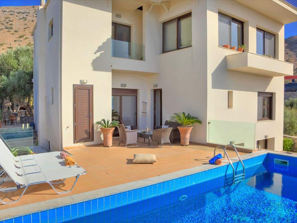 The villa is set in grounds of 900 square meters, on a hillside above the Bay of Elounda, with magnificent views, just 1 kilometre from Elounda and 8 kilometers from Agios Nikolaos. This modern 250 square meter villa has 5 bedrooms, all with en-suite bathrooms and air conditioning.